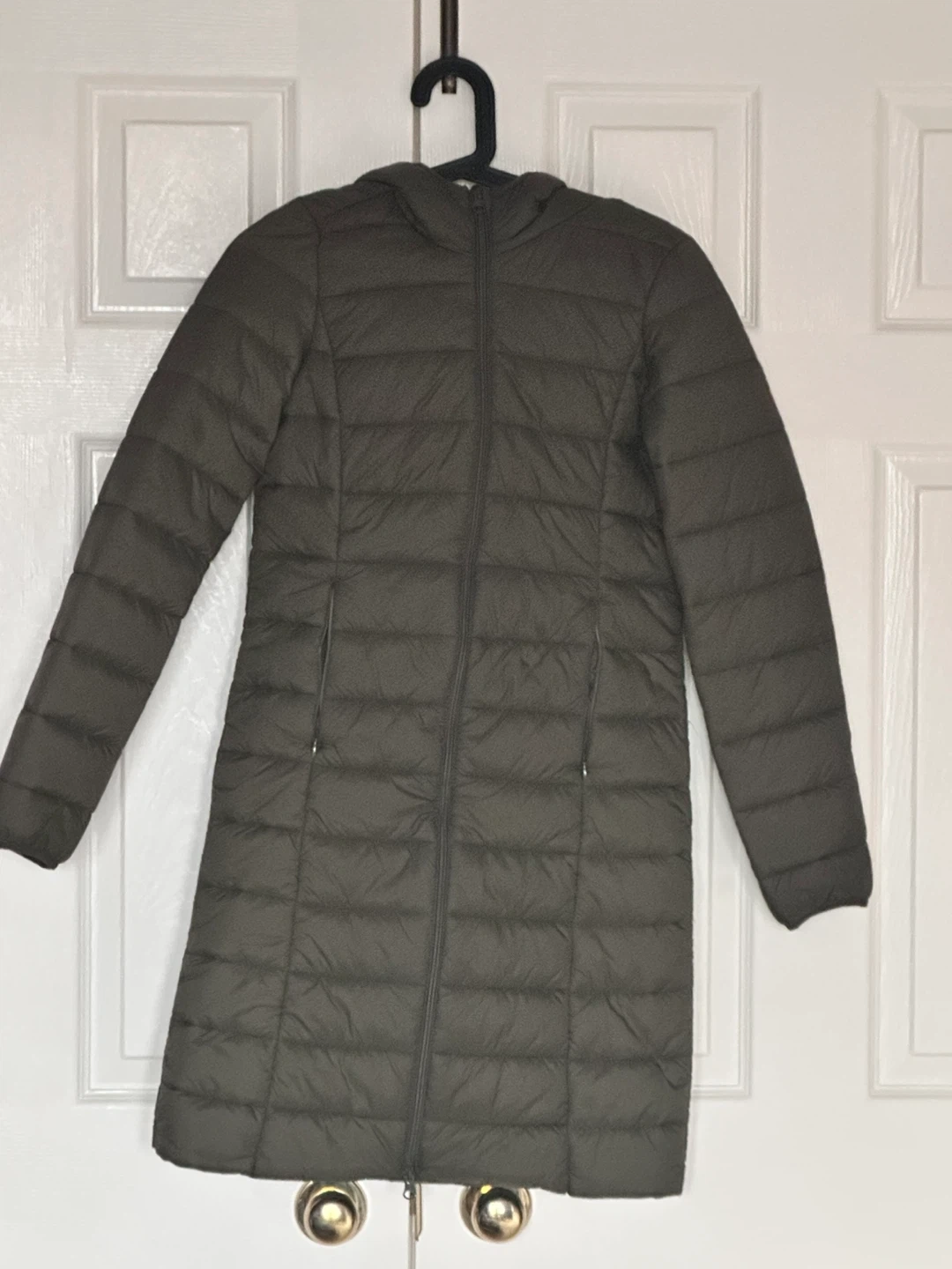 A lightweight, hooded puffer coat in a dark olive green colour. It's a full-zip style with zippered pockets. This coat is great for staying warm on chilly days!