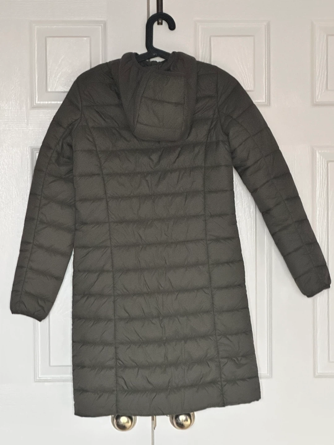 A lightweight, hooded puffer coat in a dark olive green colour. It's a full-zip style with zippered pockets. This coat is great for staying warm on chilly days!