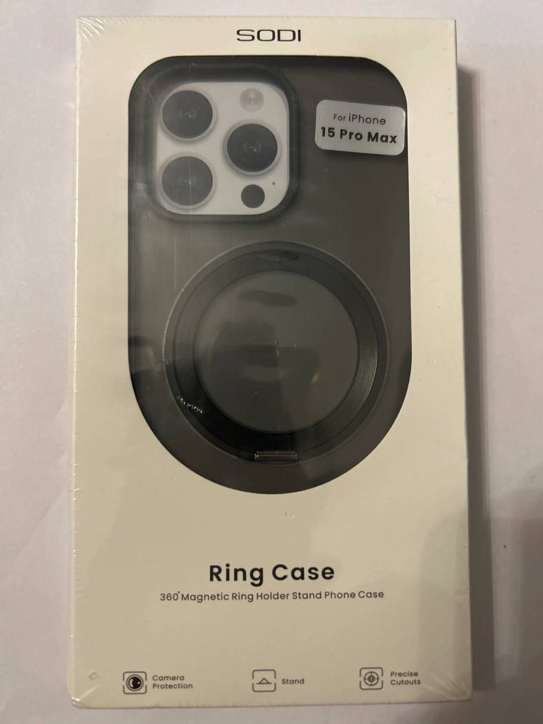 This is a brand new SODI Ring Case for the iPhone 15 Pro Max. It features a 360° magnetic ring holder stand. It offers camera protection, a stand, and precise cutouts. Model number is SIT-150.