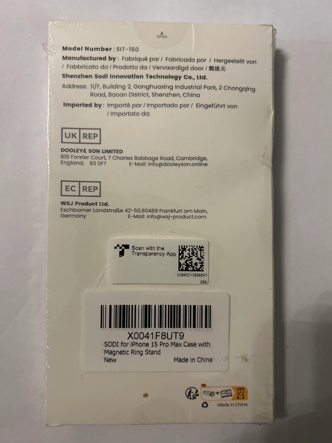 This is a brand new SODI Ring Case for the iPhone 15 Pro Max. It features a 360° magnetic ring holder stand. It offers camera protection, a stand, and precise cutouts. Model number is SIT-150.