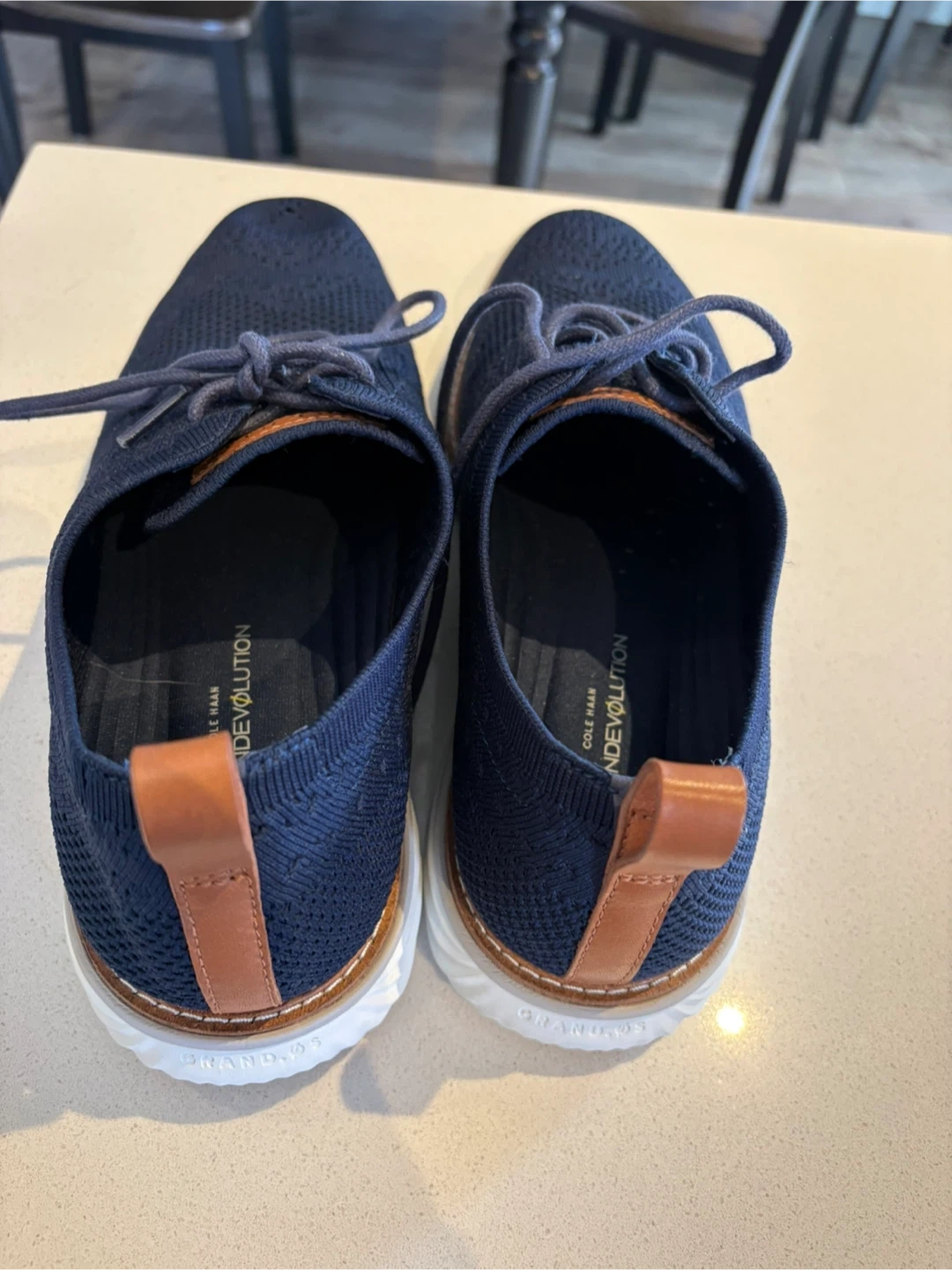 Cole Haan GrandEvoultion blue knit oxford shoes for men. These feature a breathable knit upper and comfortable cushioning. They're a men's size 10.
