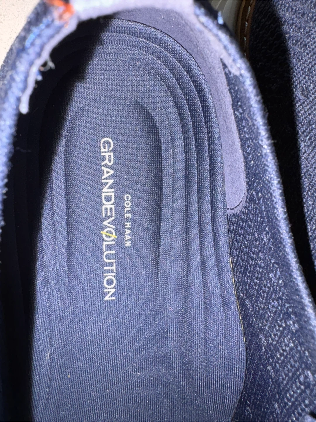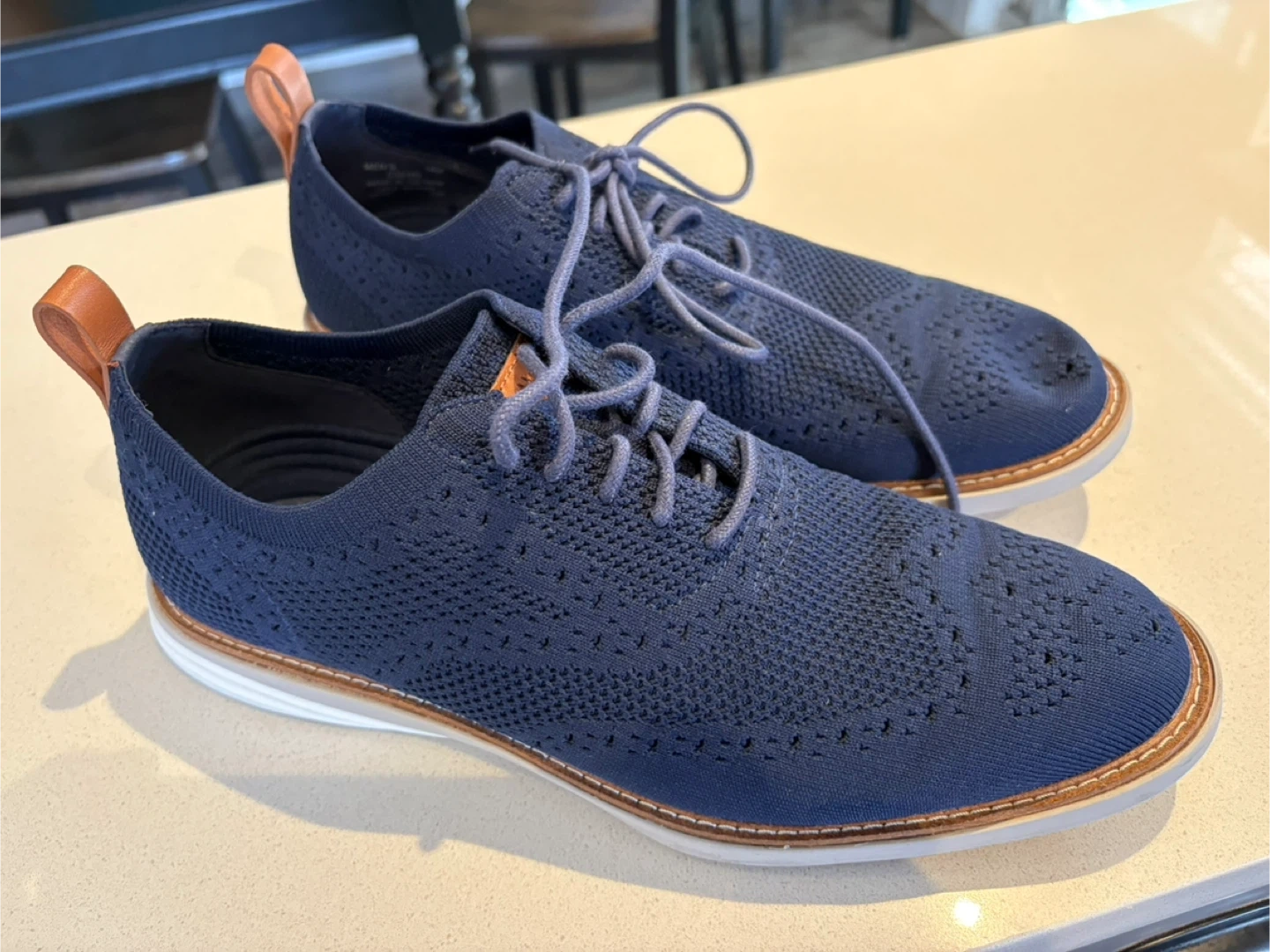 Cole Haan GrandEvoultion blue knit oxford shoes for men. These feature a breathable knit upper and comfortable cushioning. They're a men's size 10.