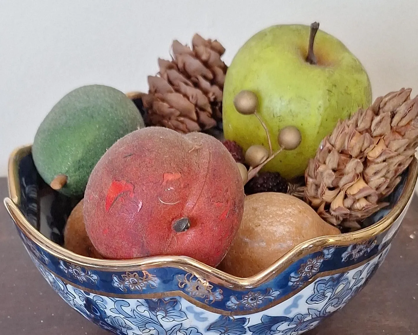 A decorative bowl filled with faux fruit and pinecones. The bowl has a blue and white floral pattern with a gold rim. It's a nice piece to add some color to your home decor