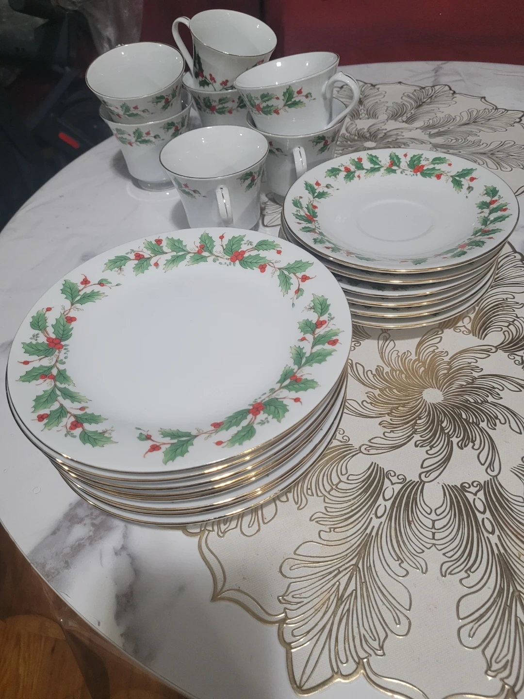 Holiday teacup and saucer set featuring a festive holly and berry design. Includes several plates with matching gold trim. These are great for seasonal gatherings!
