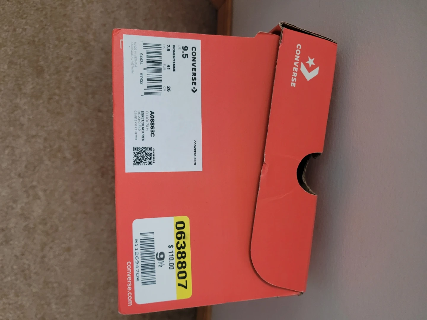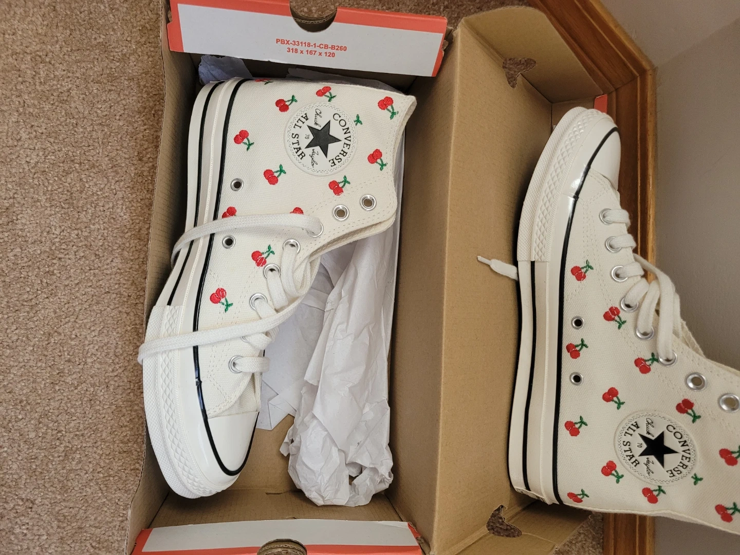 Brand New Classic white Converse Chuck Taylor All Star high top sneakers featuring a fun cherry print. Women's size 9.5 (US). Includes original box.
