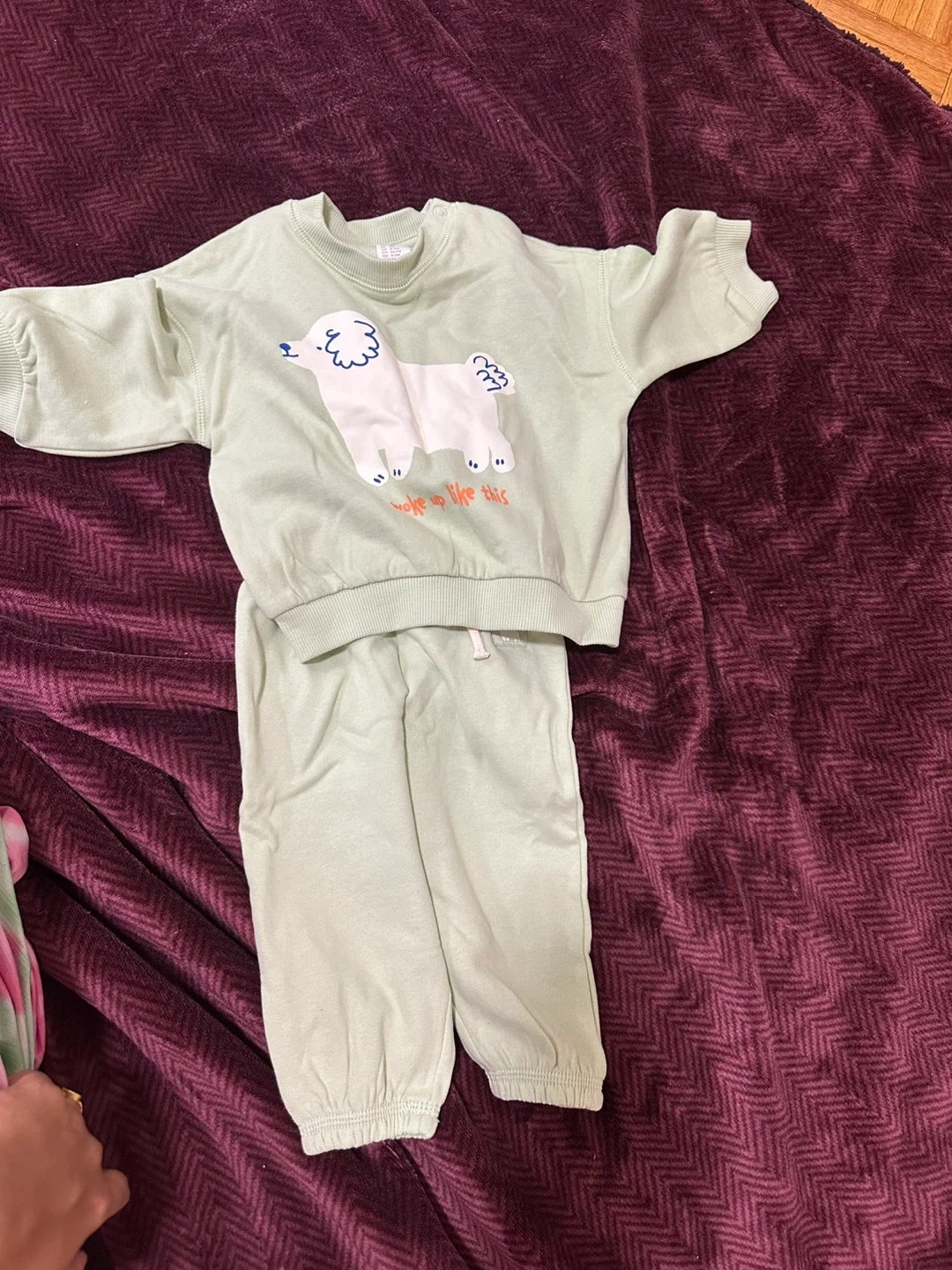 Includes a cute H&M two-piece set for 6 month old in a light green colour with an adorable dog design for $15