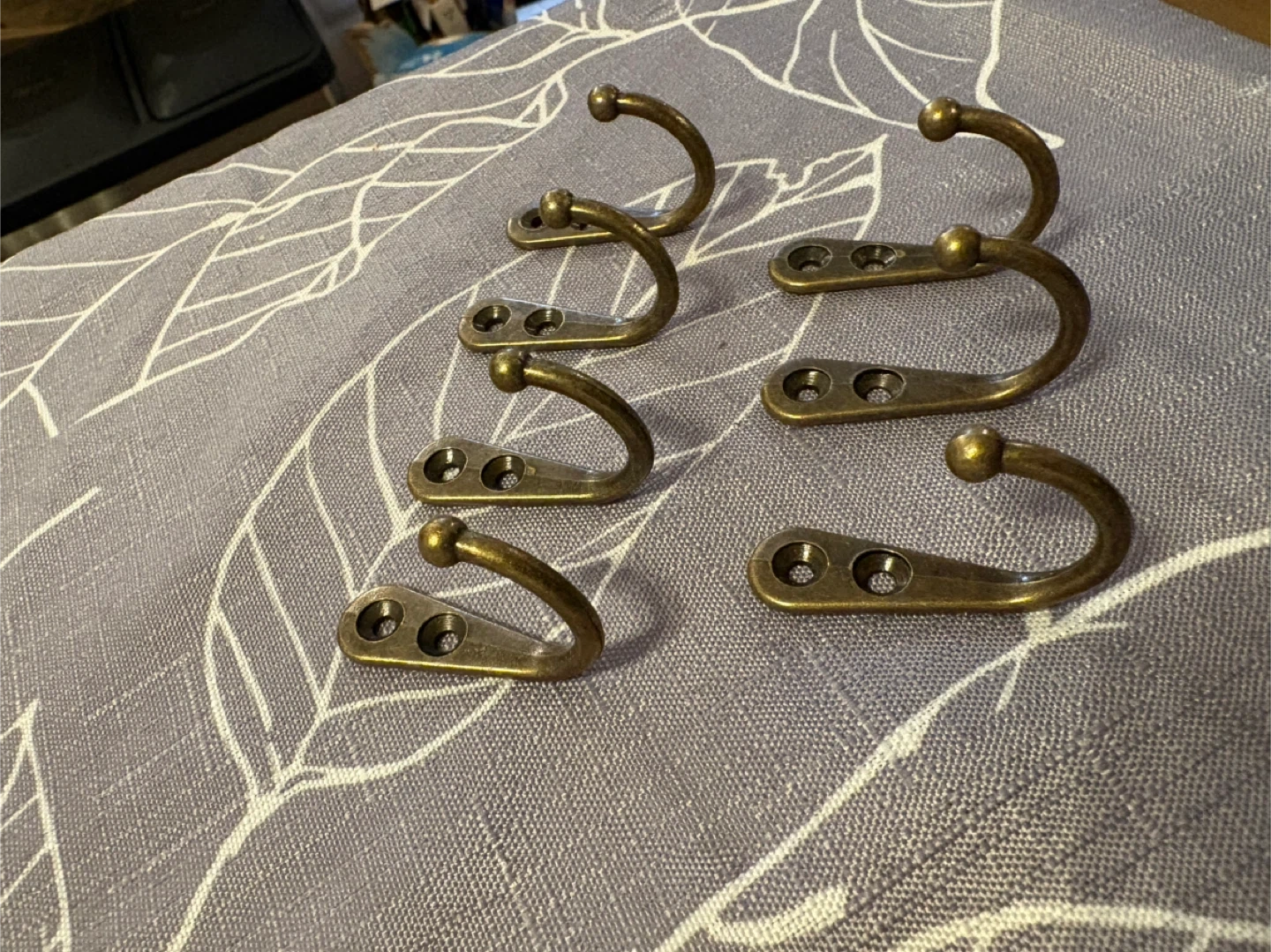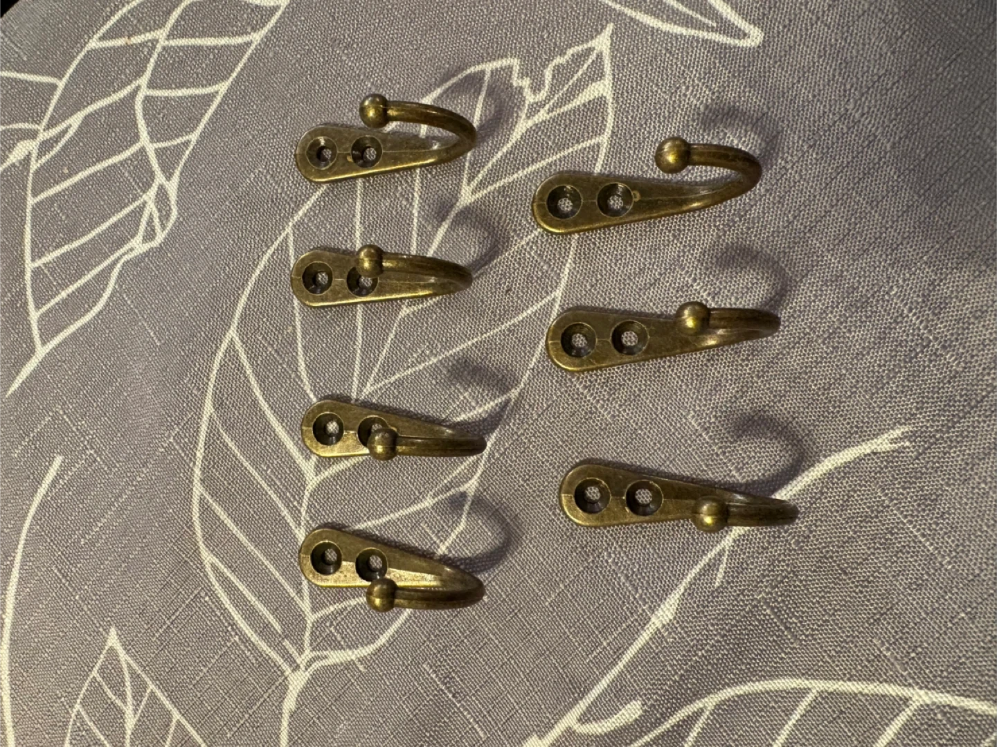 Here's a set of seven brass coat hooks. They're great for hanging coats, hats, or bags. Each hook is made of durable brass and features a classic design.
