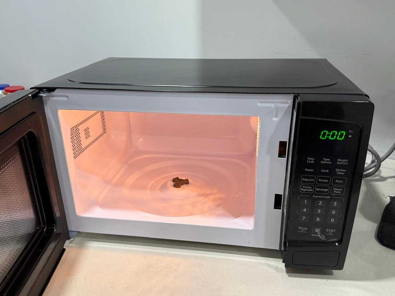 6 convenient auto cook options: popcorn, potato, pizza, frozen vegetables, beverage, dinner plate