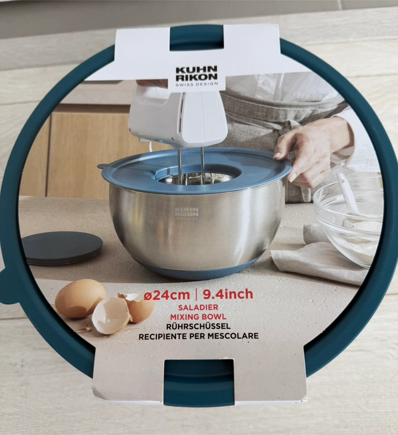 This is a Kuhn Rikon Swiss design saladier mixing bowl with a 9.4 inch diameter (24cm). It is brand new in the box. This bowl features a sleek stainless steel design with a blue non-slip base, perfect for any modern kitchen.