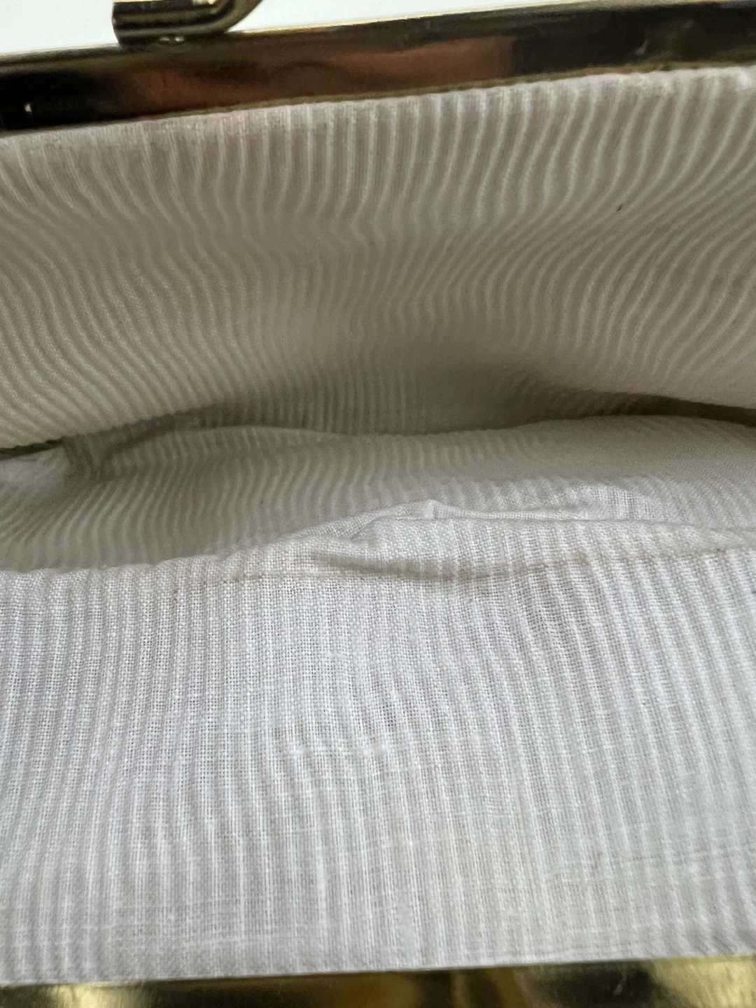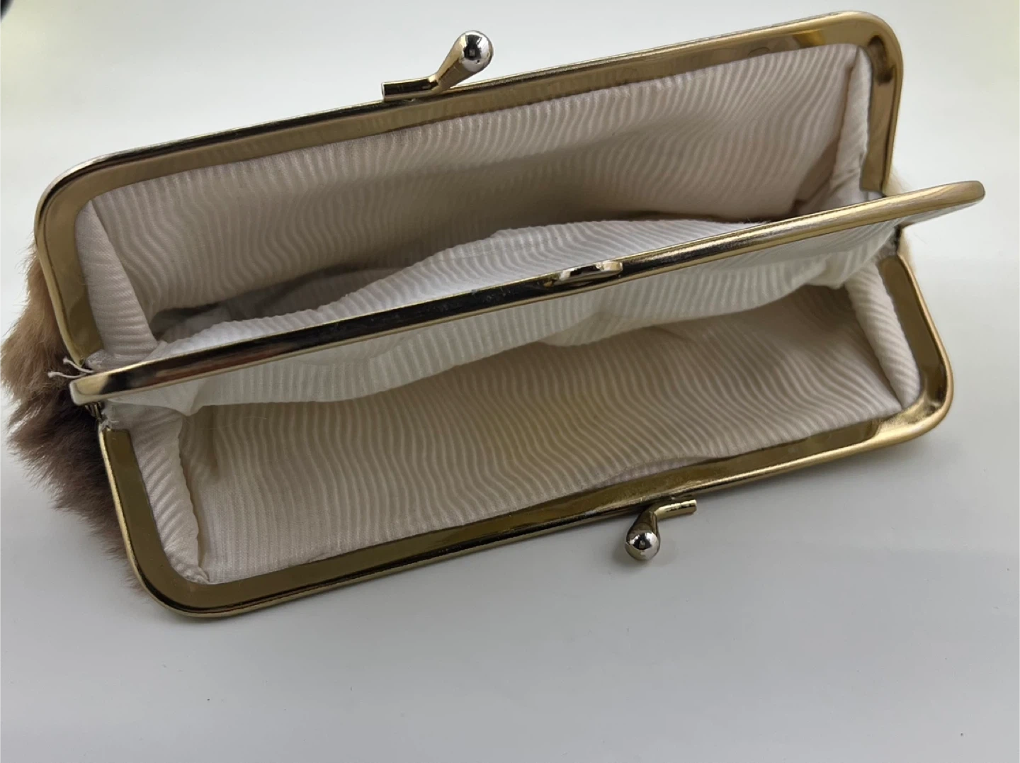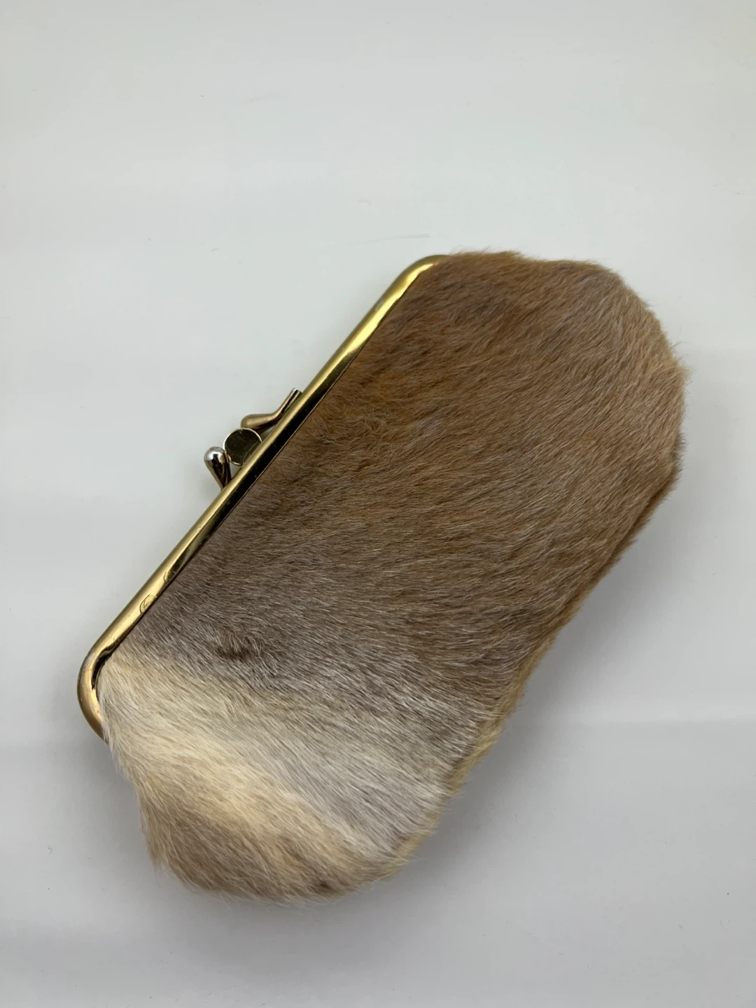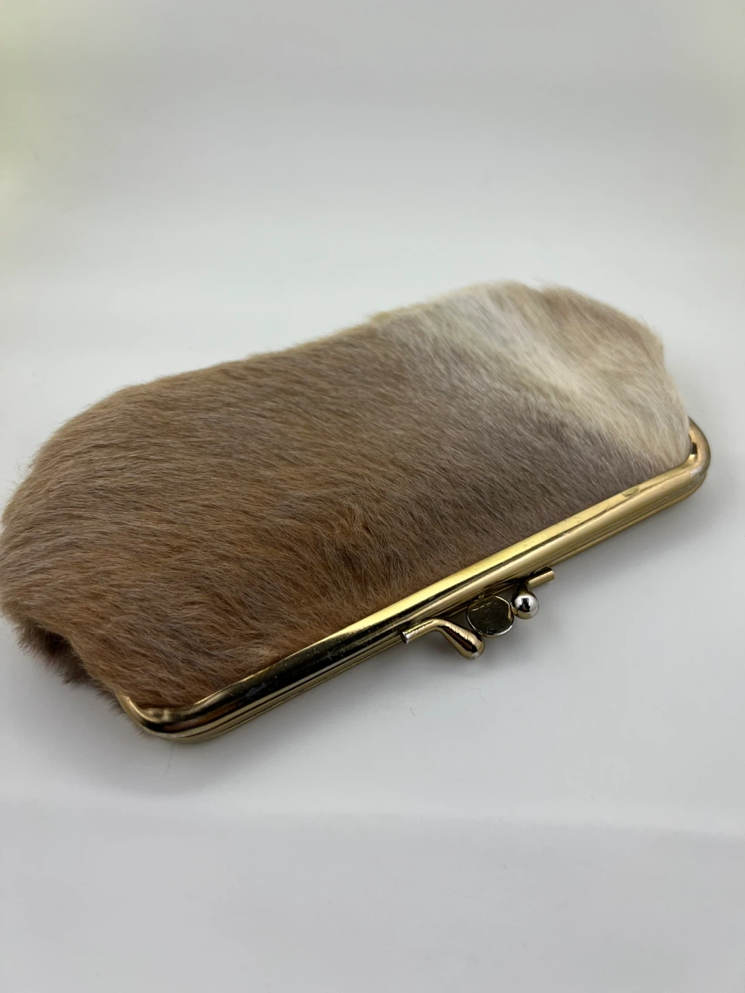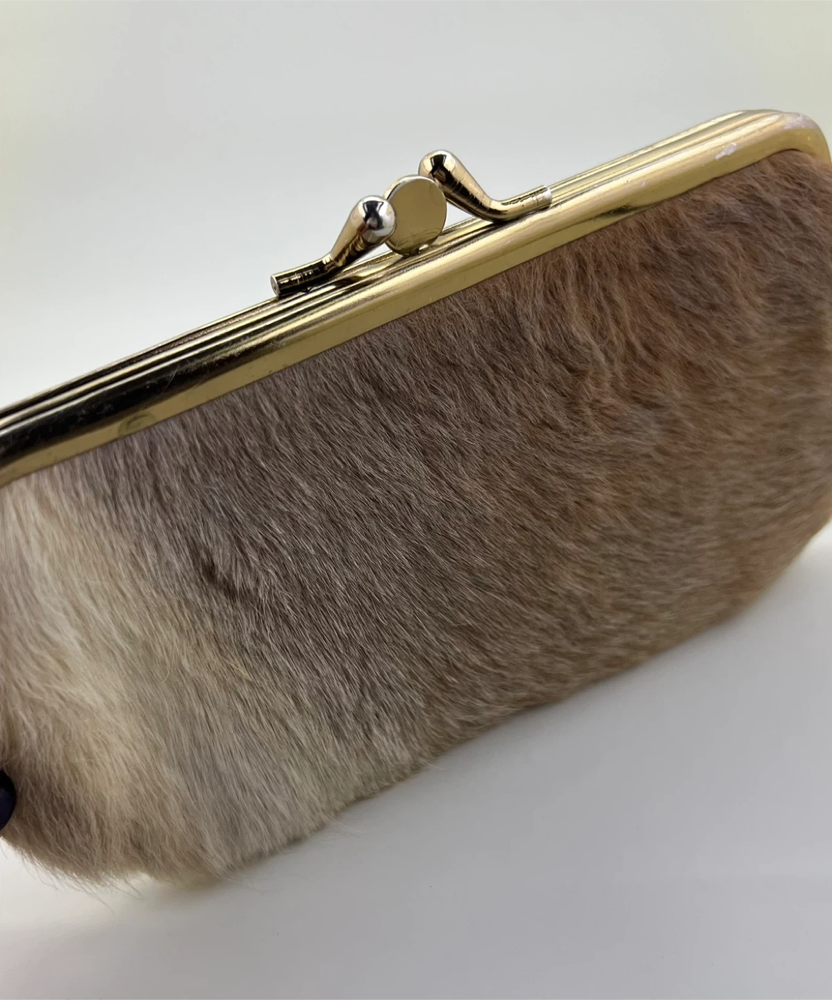 Gold tone kiss lock closure and soft, neutral-toned fur exterior