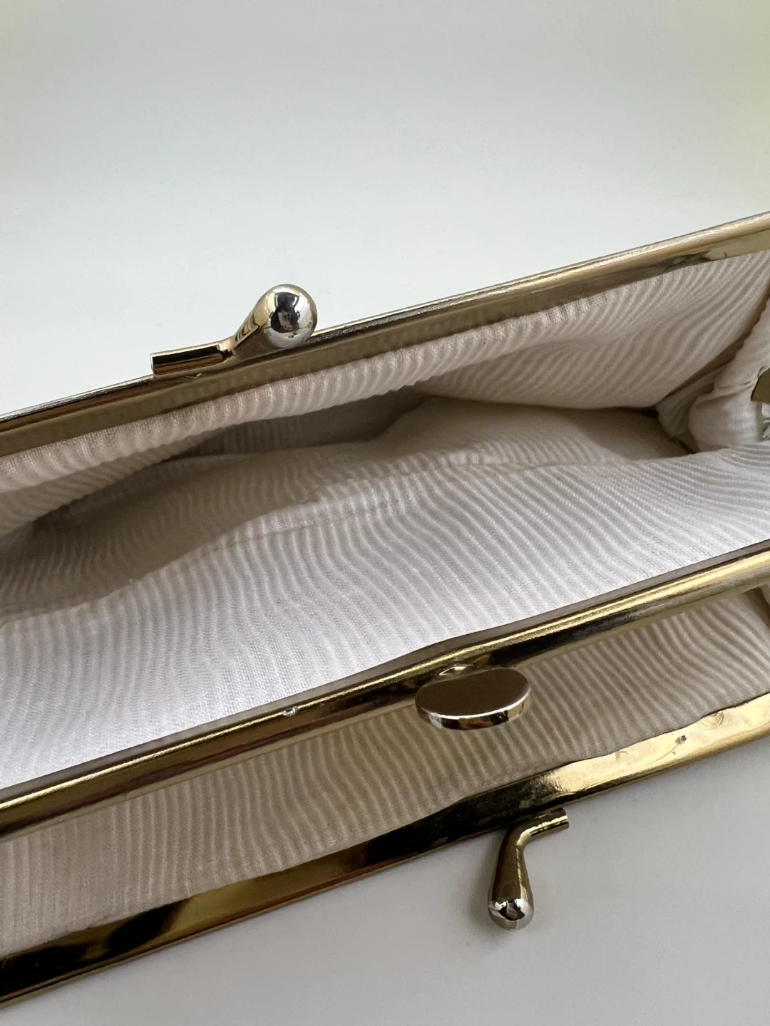 Gold tone kiss lock closure and soft, neutral-toned fur exterior