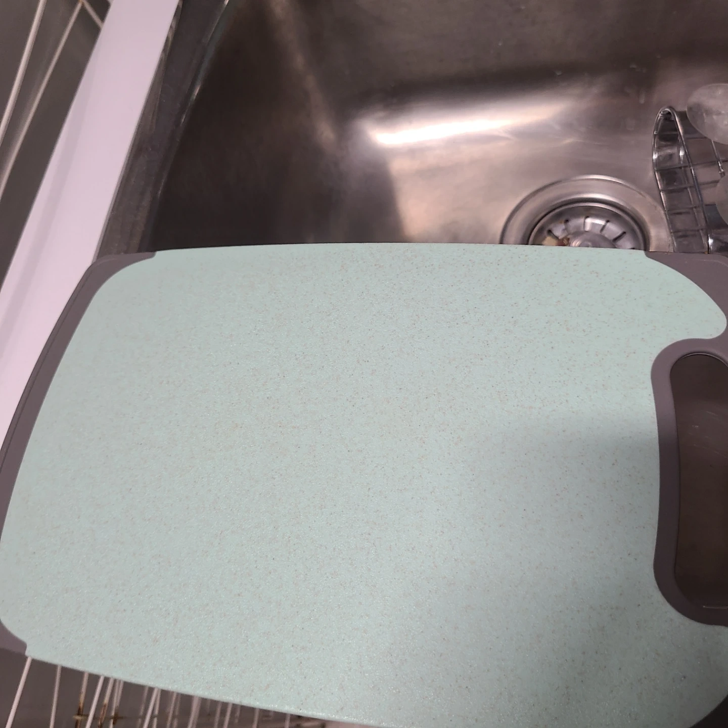 This is a light blue cutting board with a grey edge. It's made of a durable material. Perfect for everyday food prep tasks in the kitchen!