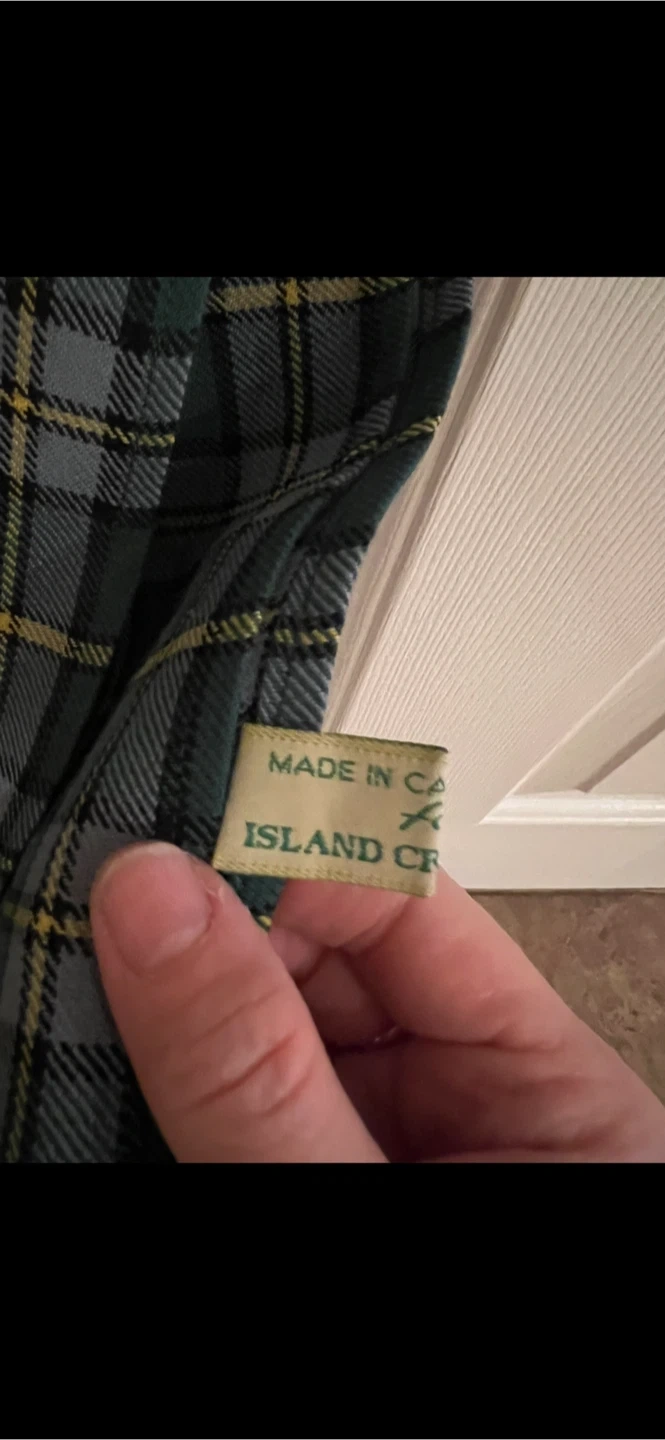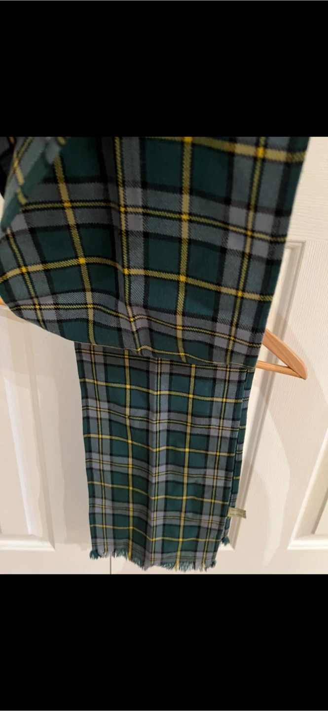 This is a plaid scarf made by Island Crafter. It's green with grey and yellow tartan. Features fringed ends. Worn once mint clean like new beautiful men’s scarf