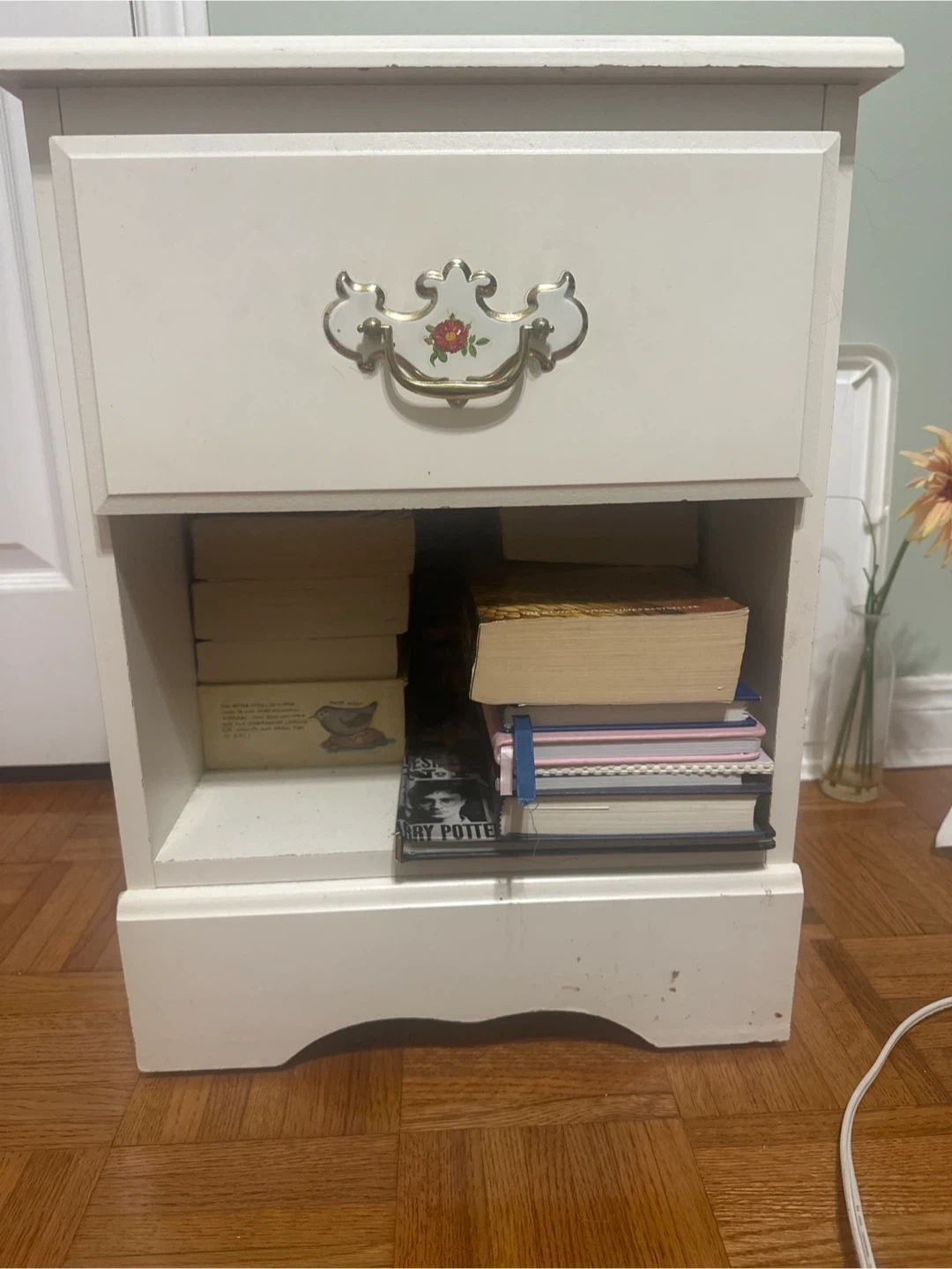Selling a cute white nightstand! It has a drawer and an open shelf, perfect for storing books or other bedside essentials. There are some signs of wear, as seen in the photos, but it's still a functional and charming piece of furniture