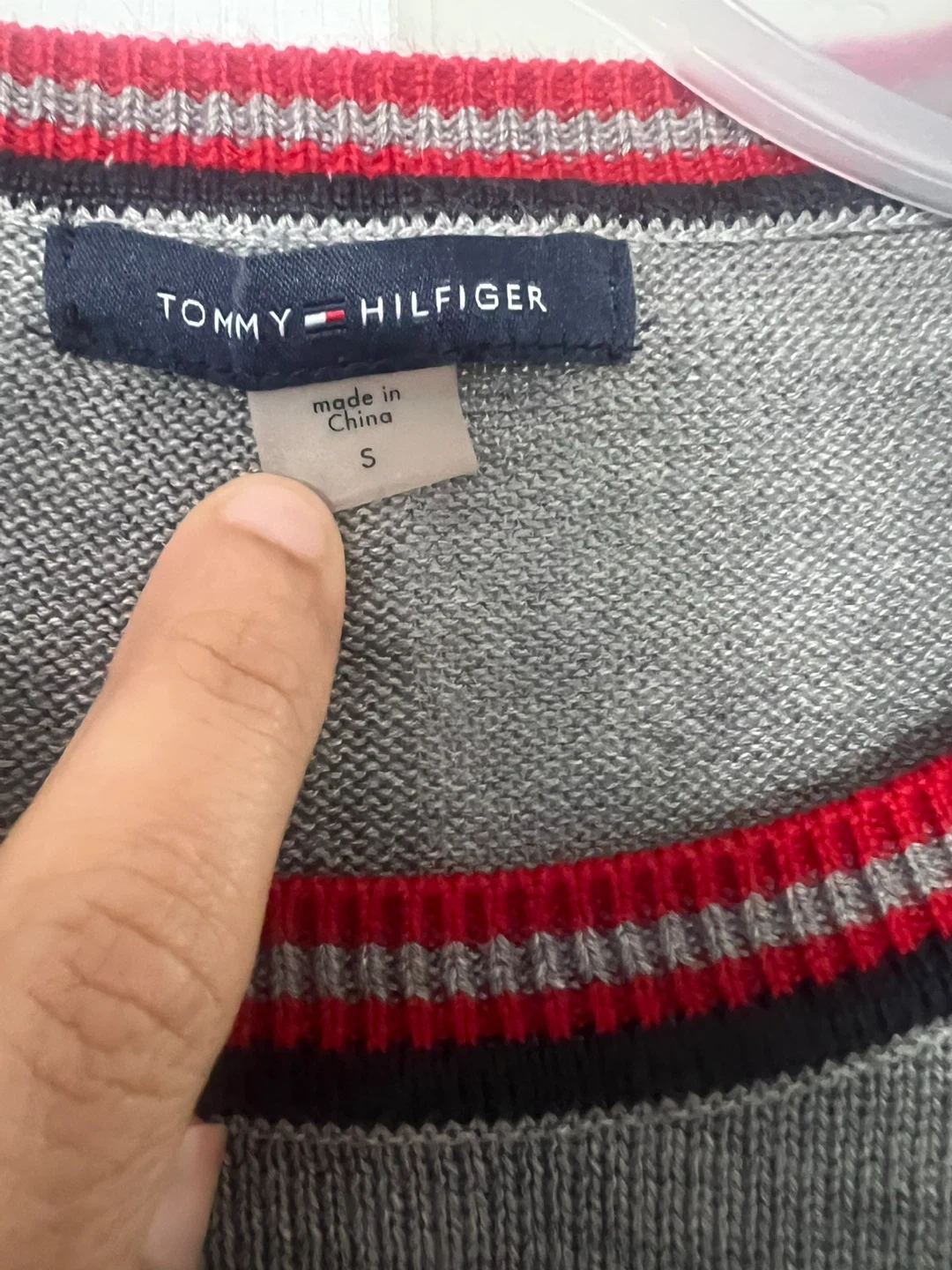 This is a Tommy Hilfiger sweater dress with a heart design. It's grey and features striped cuffs and neckline. Size is small.