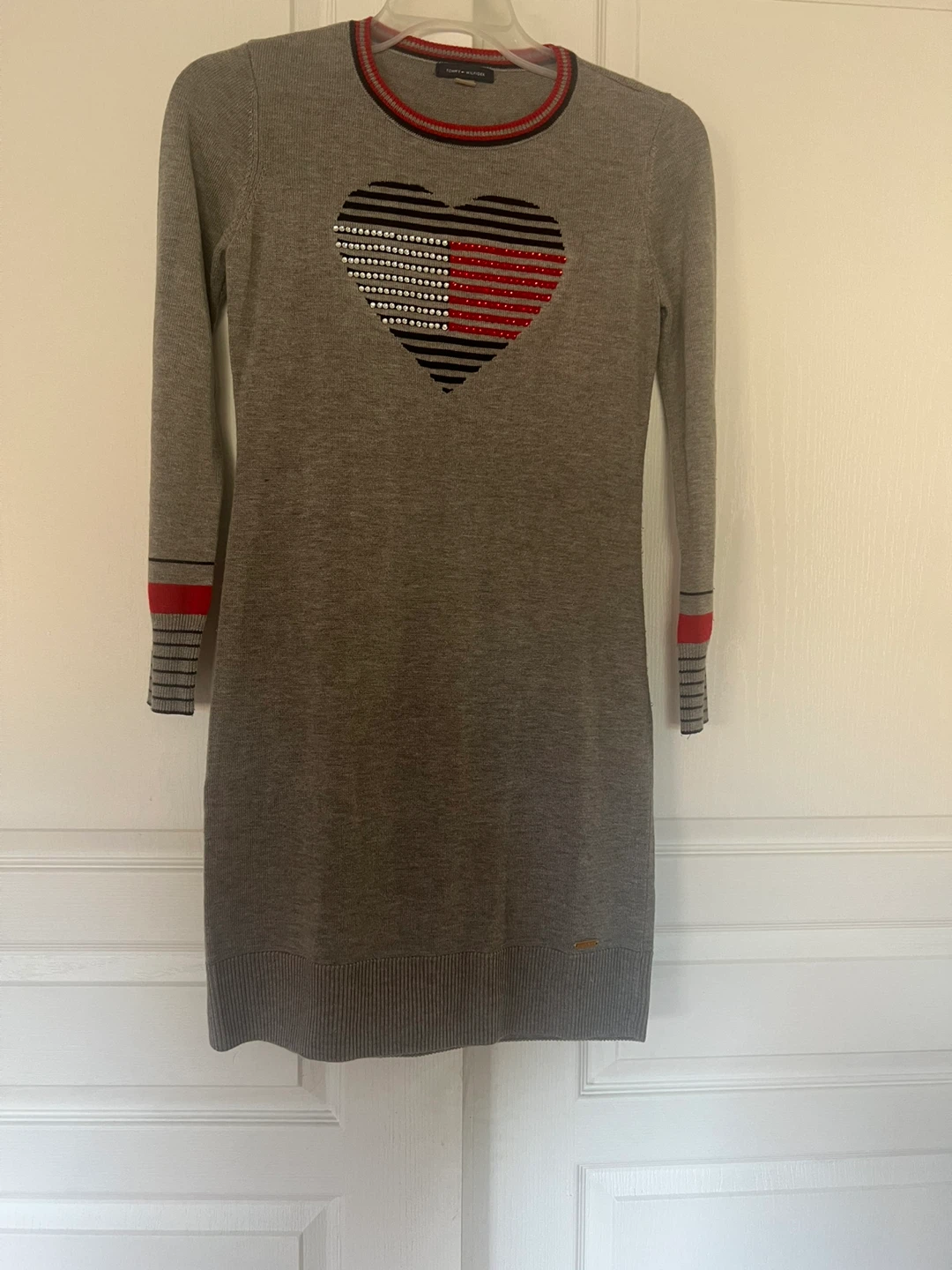 This is a Tommy Hilfiger sweater dress with a heart design. It's grey and features striped cuffs and neckline. Size is small.