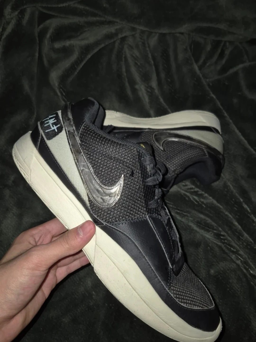 These are JA 1 Nike basketball shoes. They feature a mesh and leather upper with a durable rubber sole. These shoes are great for playing basketball.
