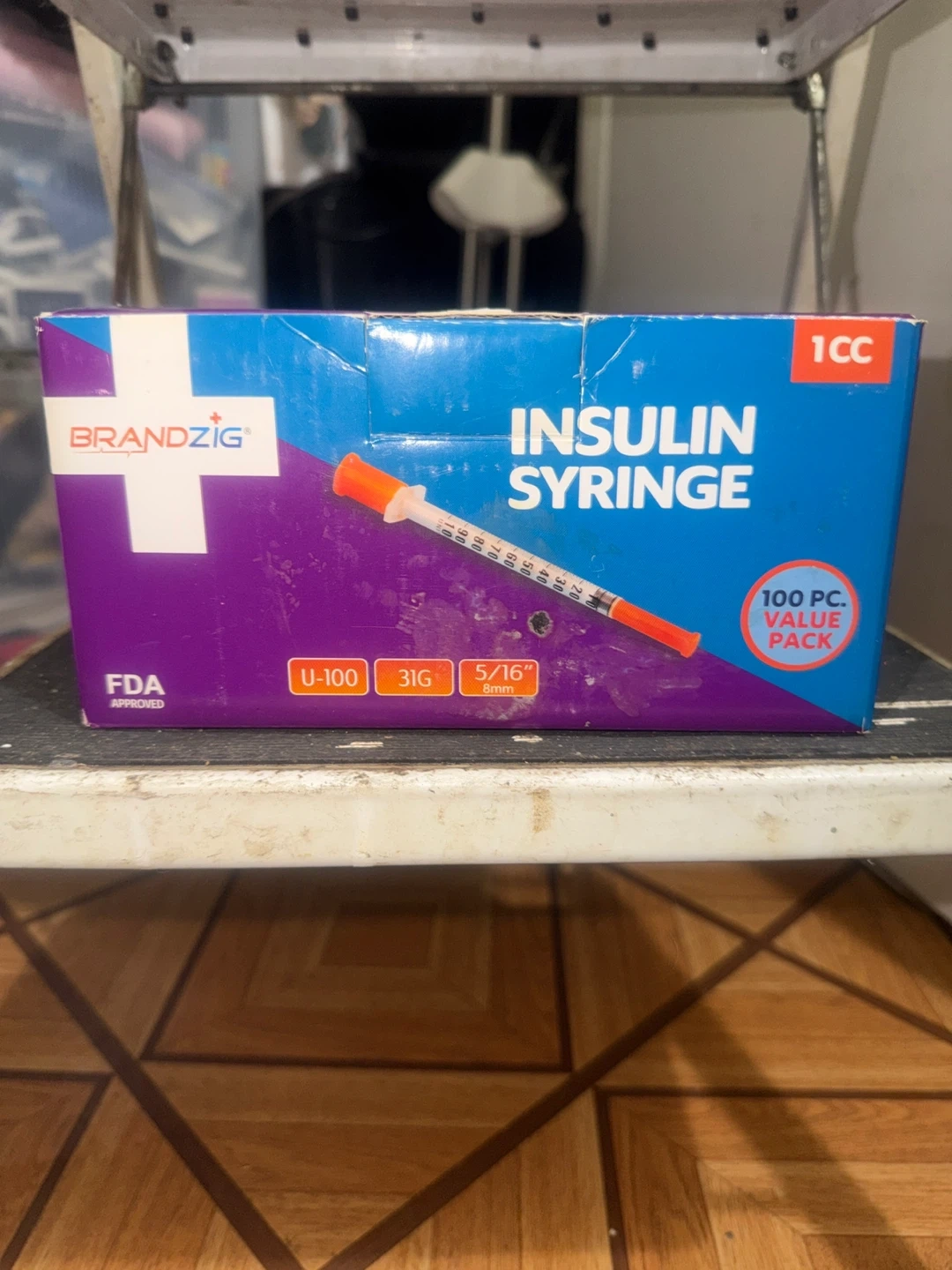 BRANDZIG insulin syringes in a 100 piece value pack. Includes 1cc syringes with U-100 measurement, 31 gauge needle, and 5/16 inch length (8mm). FDA approved.