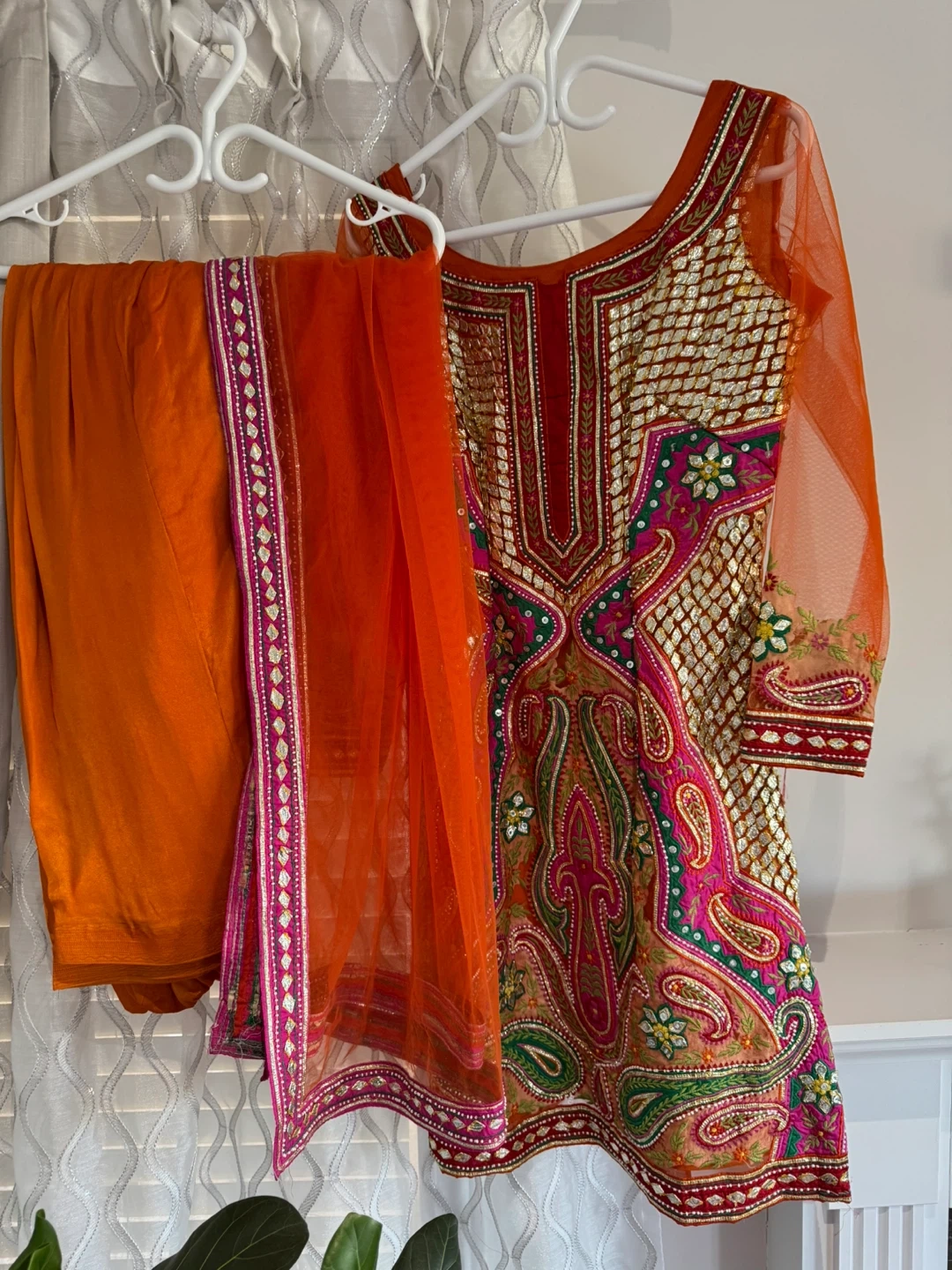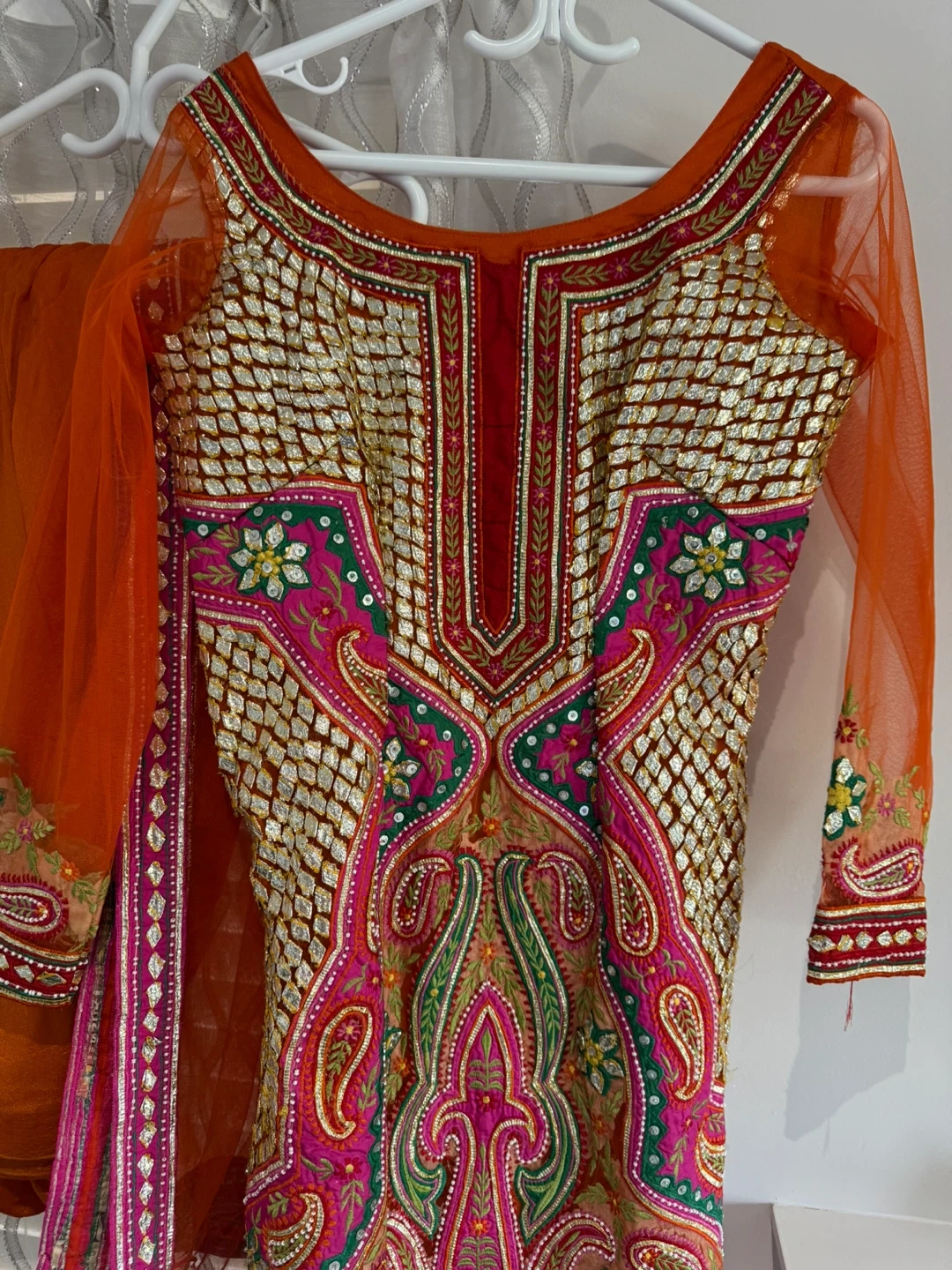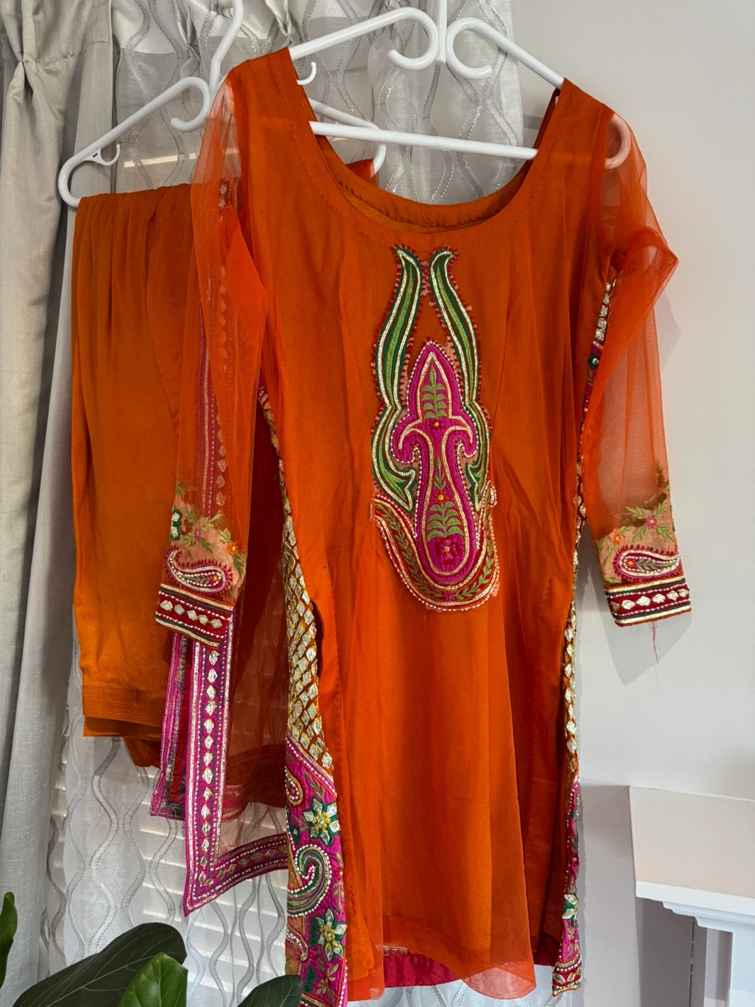 This is a vibrant orange three-piece salwar kameez set with intricate embroidery and sequin details . It features sheer net sleeves on the kameez and a coordinating orange dupatta. This outfit's detailed embellishments make it suitable for festive occasions.