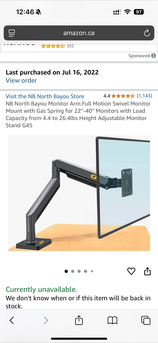Selling a NB North Bayou monitor arm! It's a full motion swivel mount with a gas spring. It's designed for 22"-40" monitors and can handle a load capacity from 4.4 to 26.4lbs. It's height adjustable, and it's a monitor stand G45.