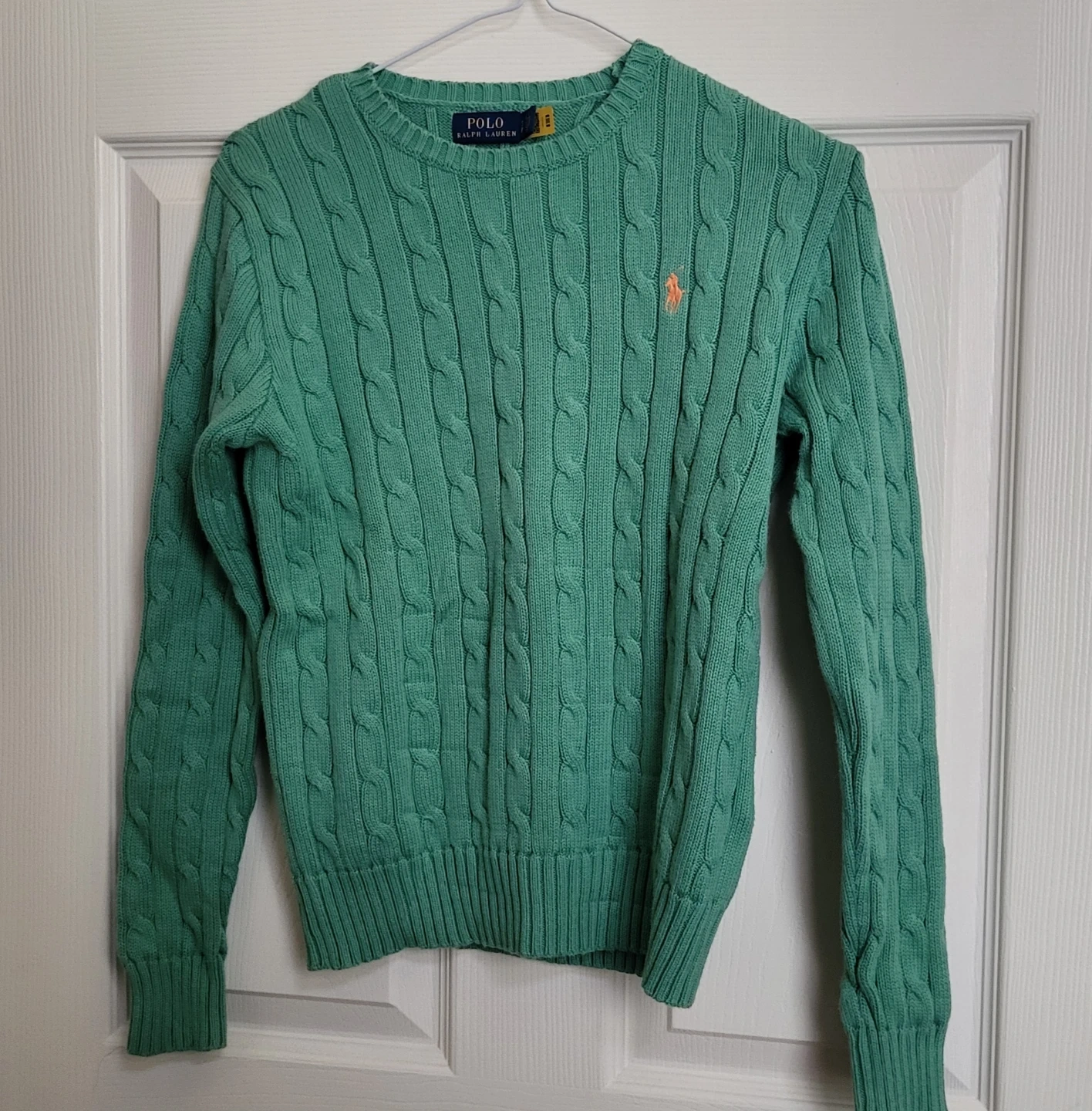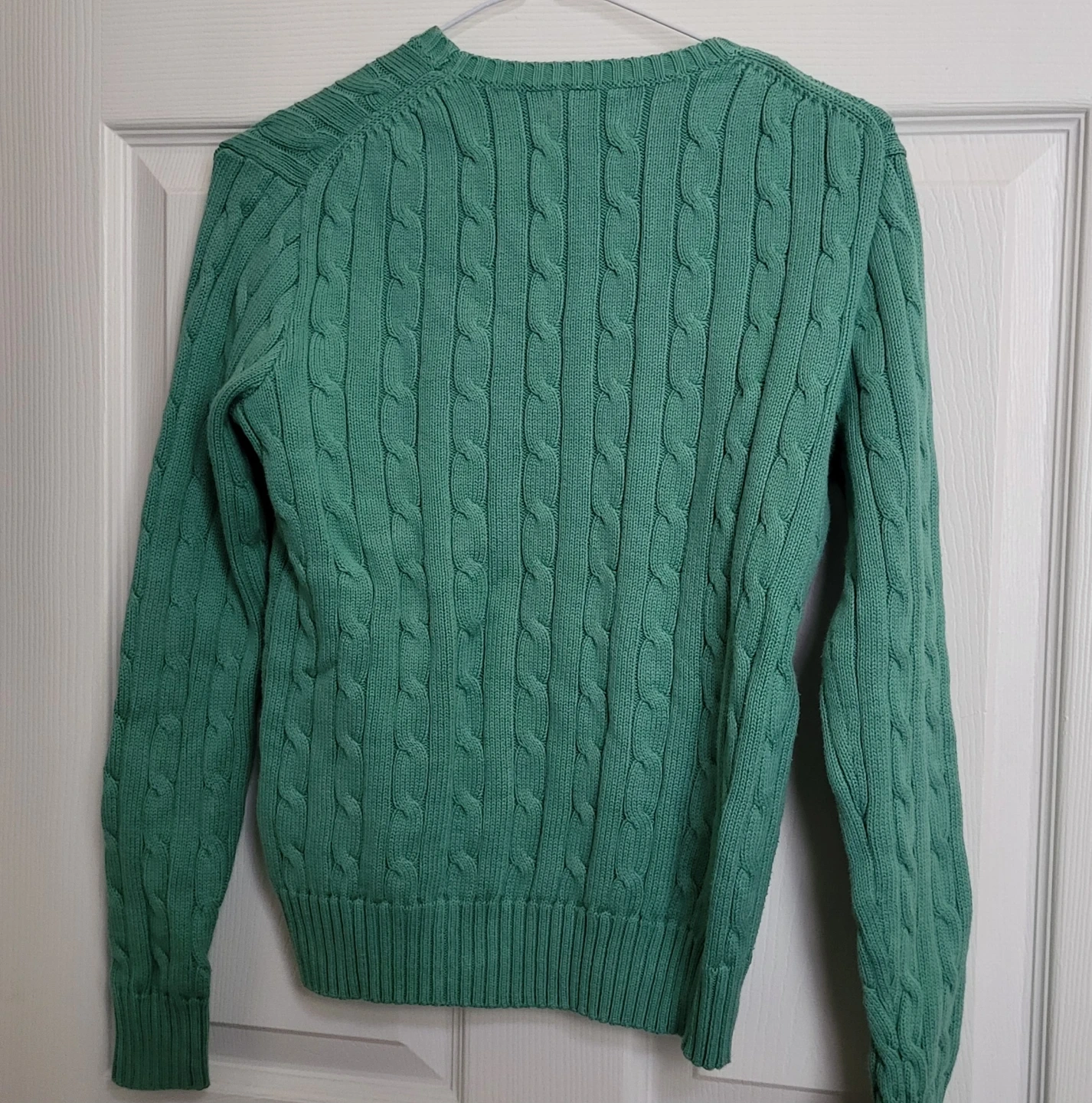 This is a green cable knit sweater from Polo Ralph Lauren (Women's). It's a size small and in great condition!