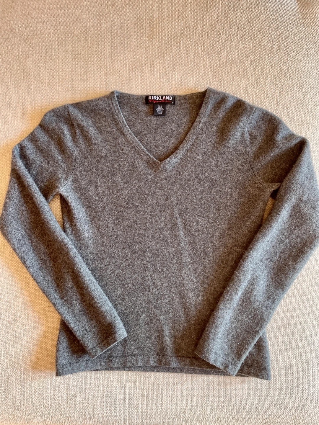 A classic grey V-neck sweater from Kirkland Signature. It's made of soft, cashmere material. This sweater is perfect for layering or wearing on its own for a casual yet put-together look.