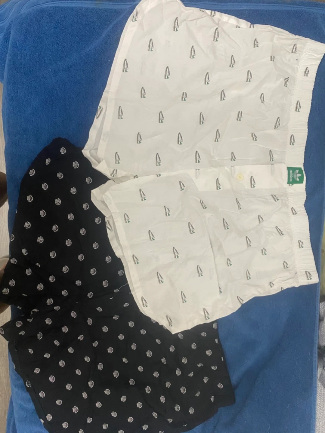 Selling a couple pairs of Adidas boxer briefs. One pair is white with sneakers pattern, and the other is black with a seashell pattern. Size XL. Pick-up Coxwell and Queen.