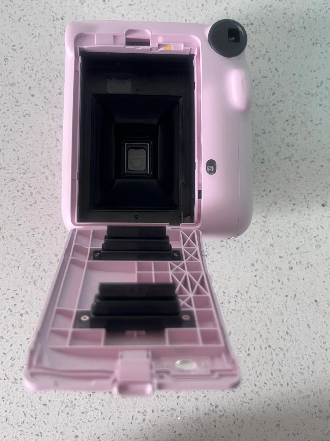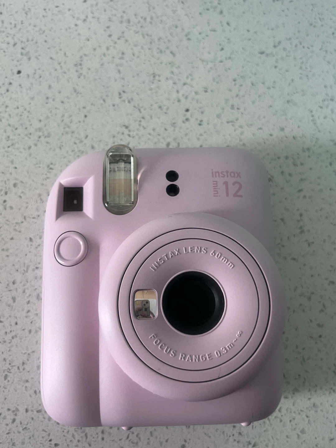 This is a Fujifilm Instax 12 Polaroid camera in pink. It features a 60mm lens with a focus range of 0.3m to infinity. It’s in great working condition as it has only been used a couple of times.