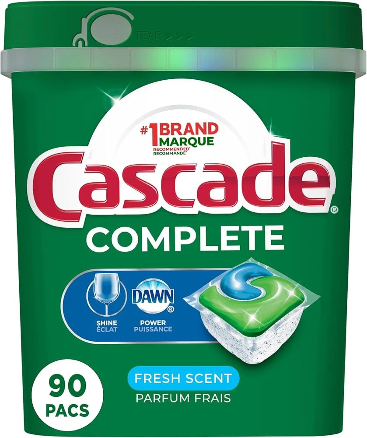 Contient 90 sacs de détergent pour lave-vaisselle Cascade Complete. Ils sont à parfum frais et combinent le pouvoir de Dawn pour combattre la graisse. La formule est conçue pour le nettoyage des plats.