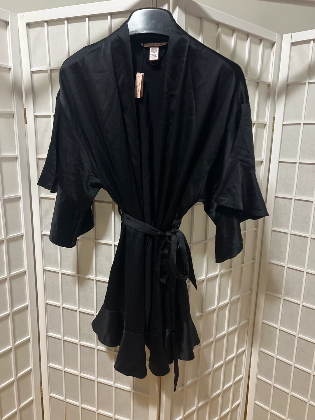 A beautiful black satin kimono robe from Victoria's Secret. It's a size small. This robe's smooth fabric feels great on the skin.