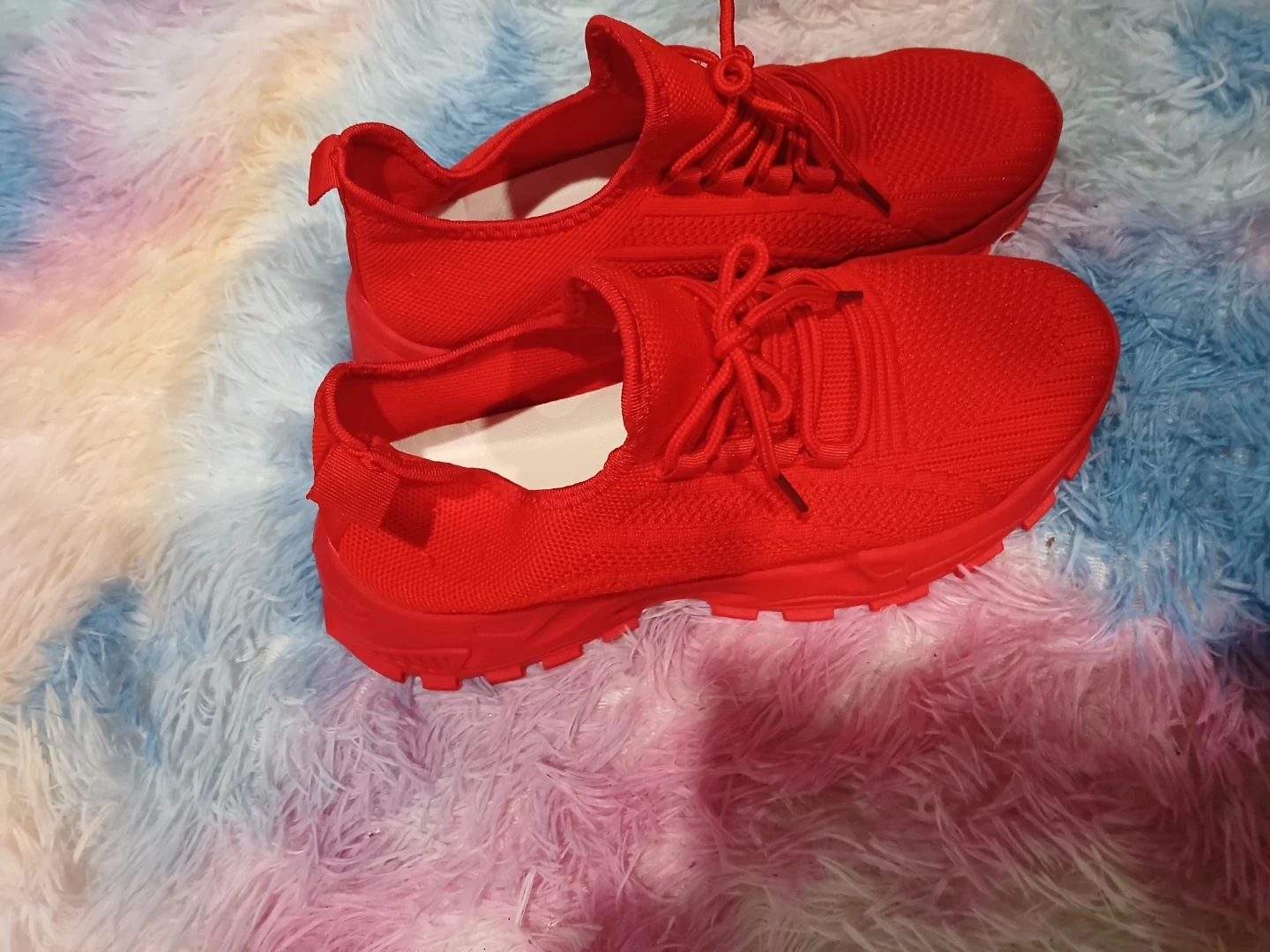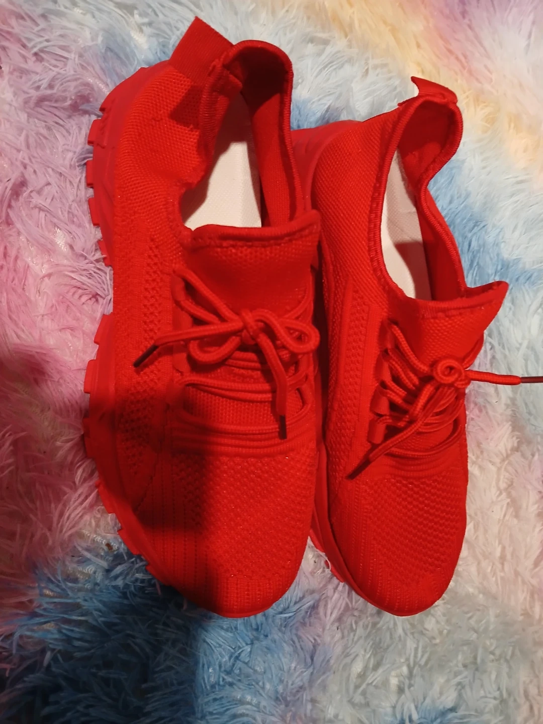 Comfortable red knit sneakers, perfect for everyday wear. These shoes feature a breathable mesh upper and a durable rubber sole. They're lightweight and offer a good grip for active use.