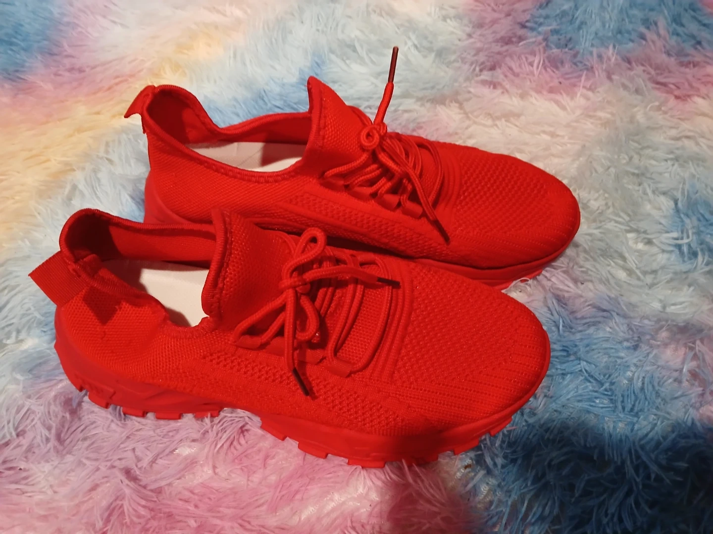 Comfortable red knit sneakers, perfect for everyday wear. These shoes feature a breathable mesh upper and a durable rubber sole. They're lightweight and offer a good grip for active use.