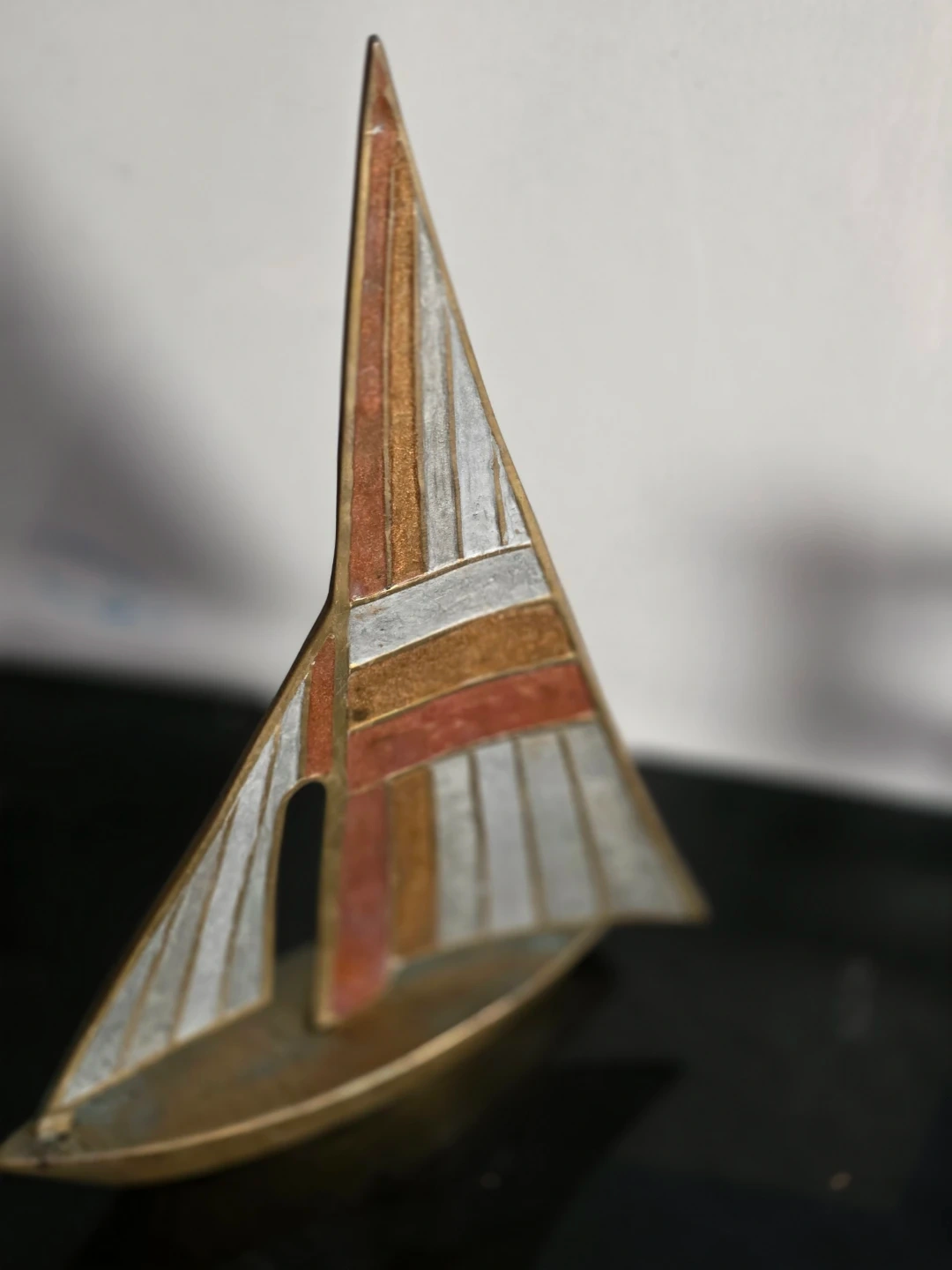 This item is a vintage Mid-Century Modern brass and enamel sailboat sculpture.