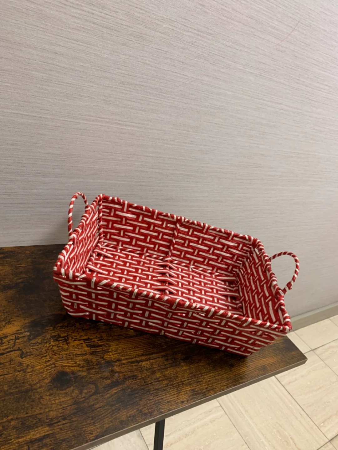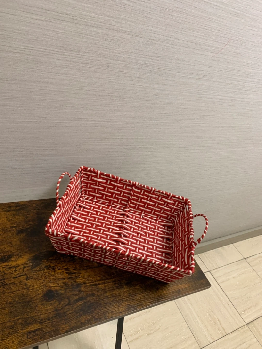 This is a red and white woven rectangular storage basket. It has built-in handles on each side. It's great for organizing small items.
