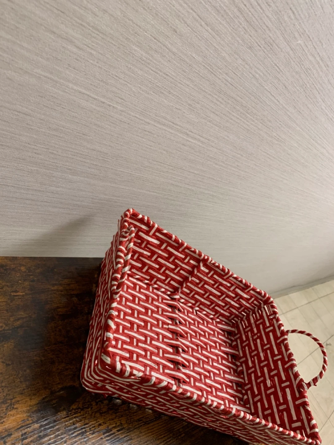 This is a red and white woven rectangular storage basket. It has built-in handles on each side. It's great for organizing small items.