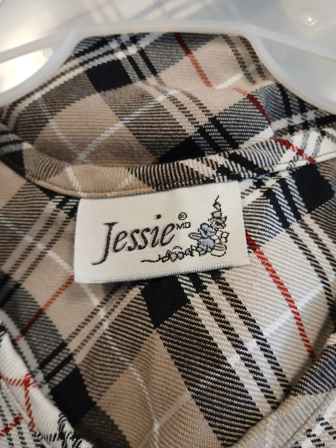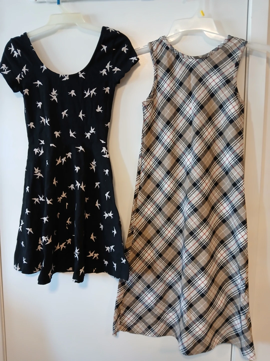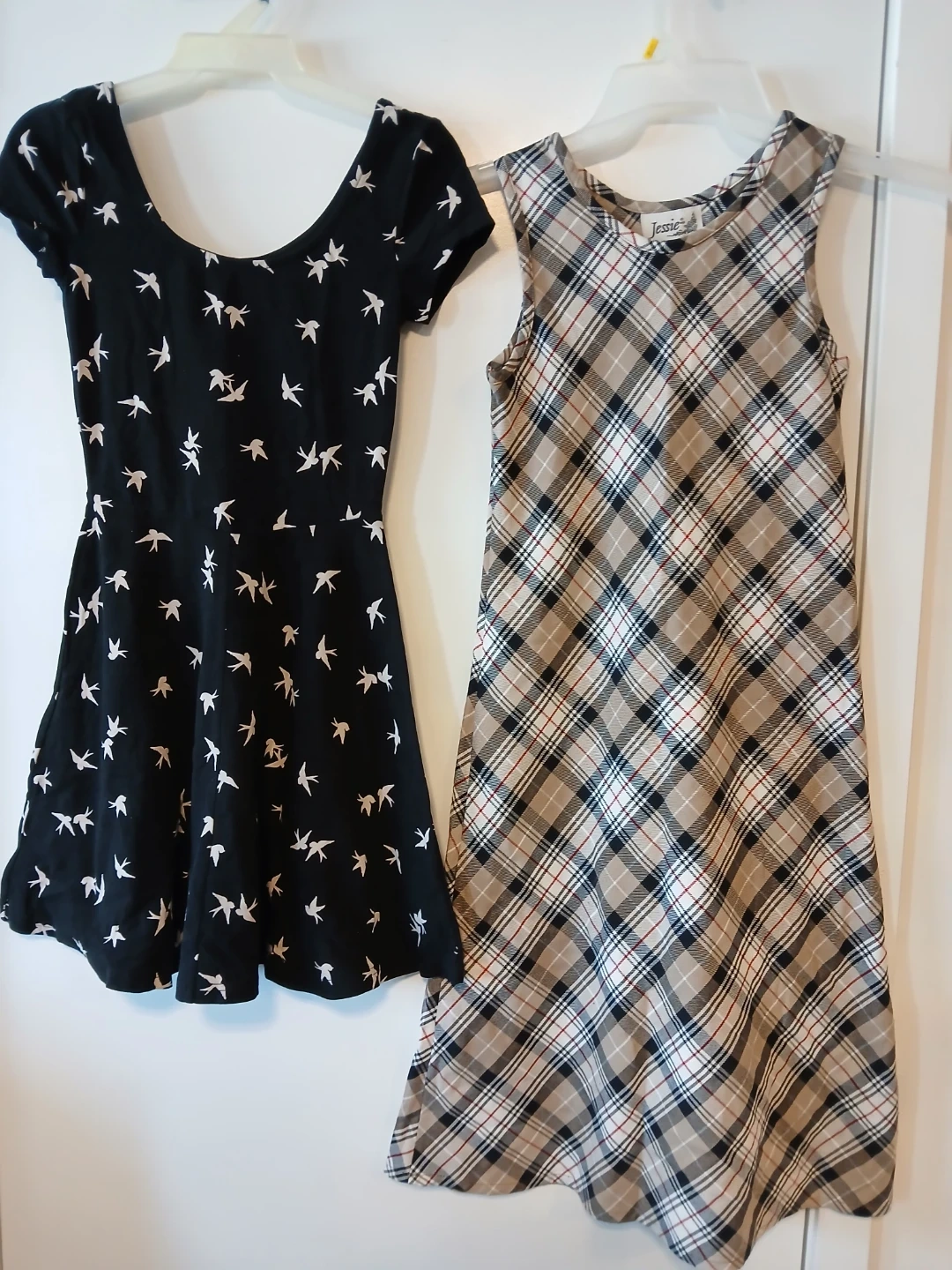 One black short-sleeve dress with a white bird print, size US 4. One sleeveless plaid dress with a taupe, black, white, and red pattern, brand Jessie. Both dresses are brand new without tags.