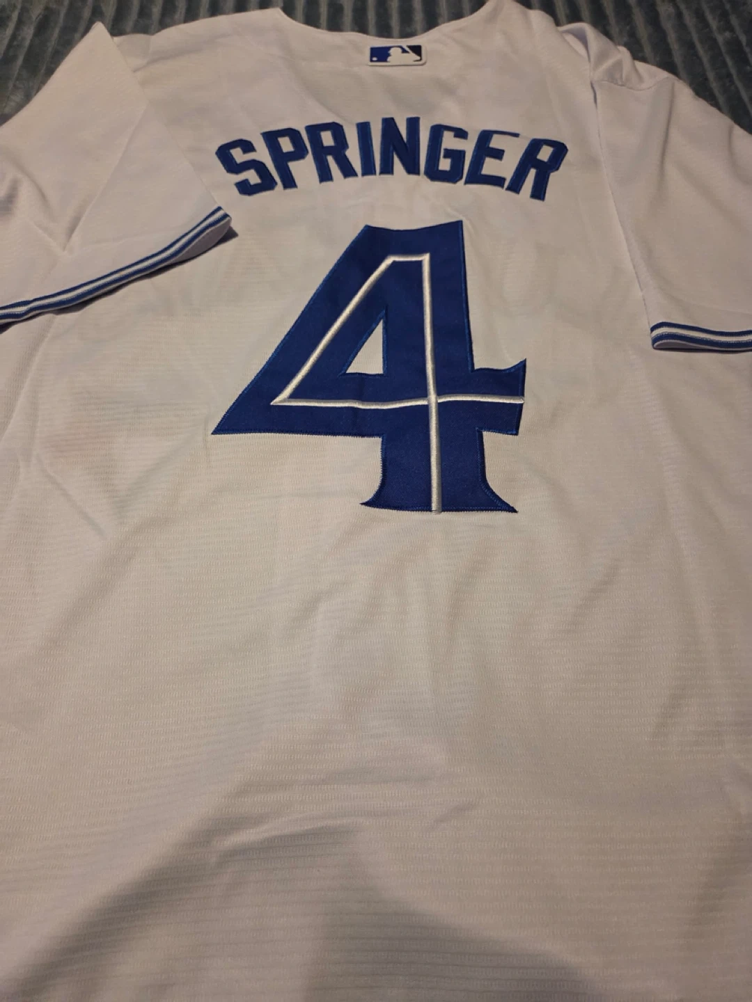 This is a Toronto Blue Jays baseball jersey featuring "Springer" and the number "4" on the back. It has the "Blue Jays" name and team logo on the front. This jersey is suitable for any baseball fan!