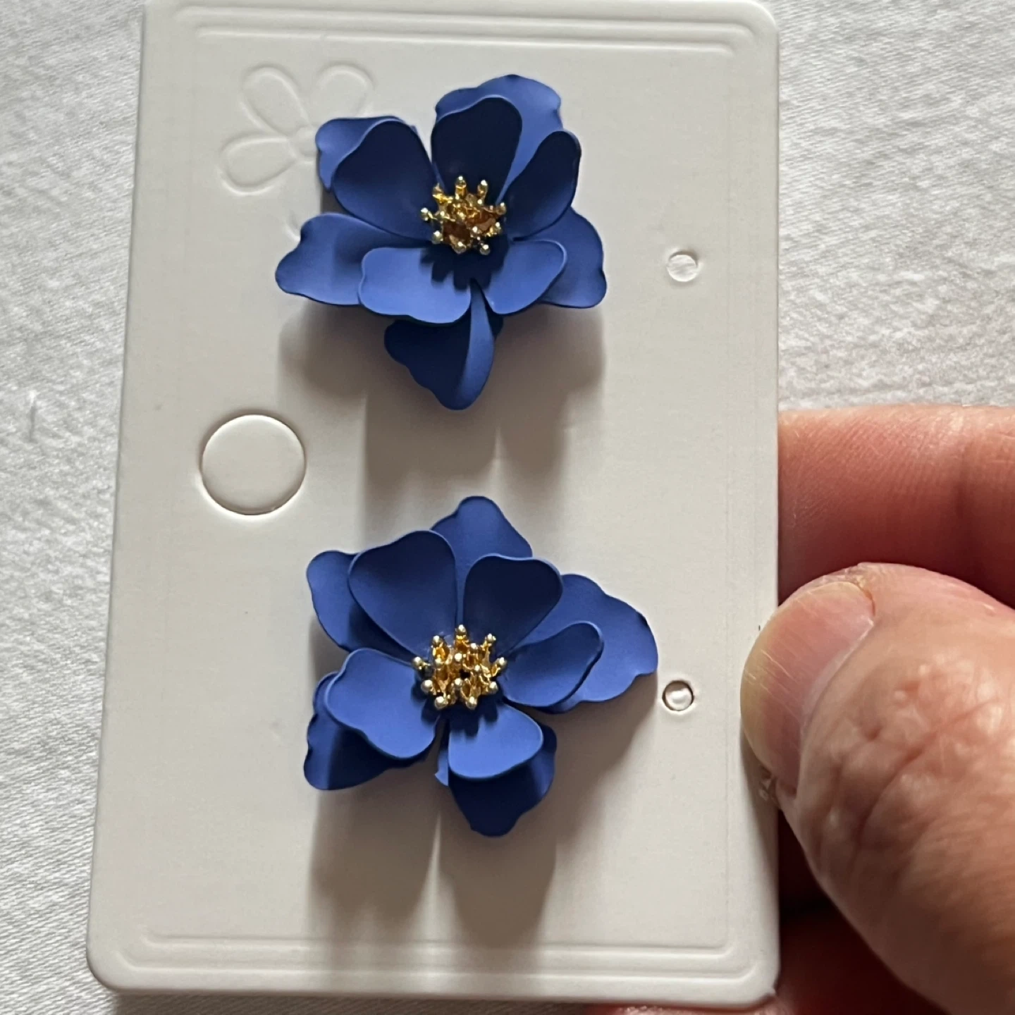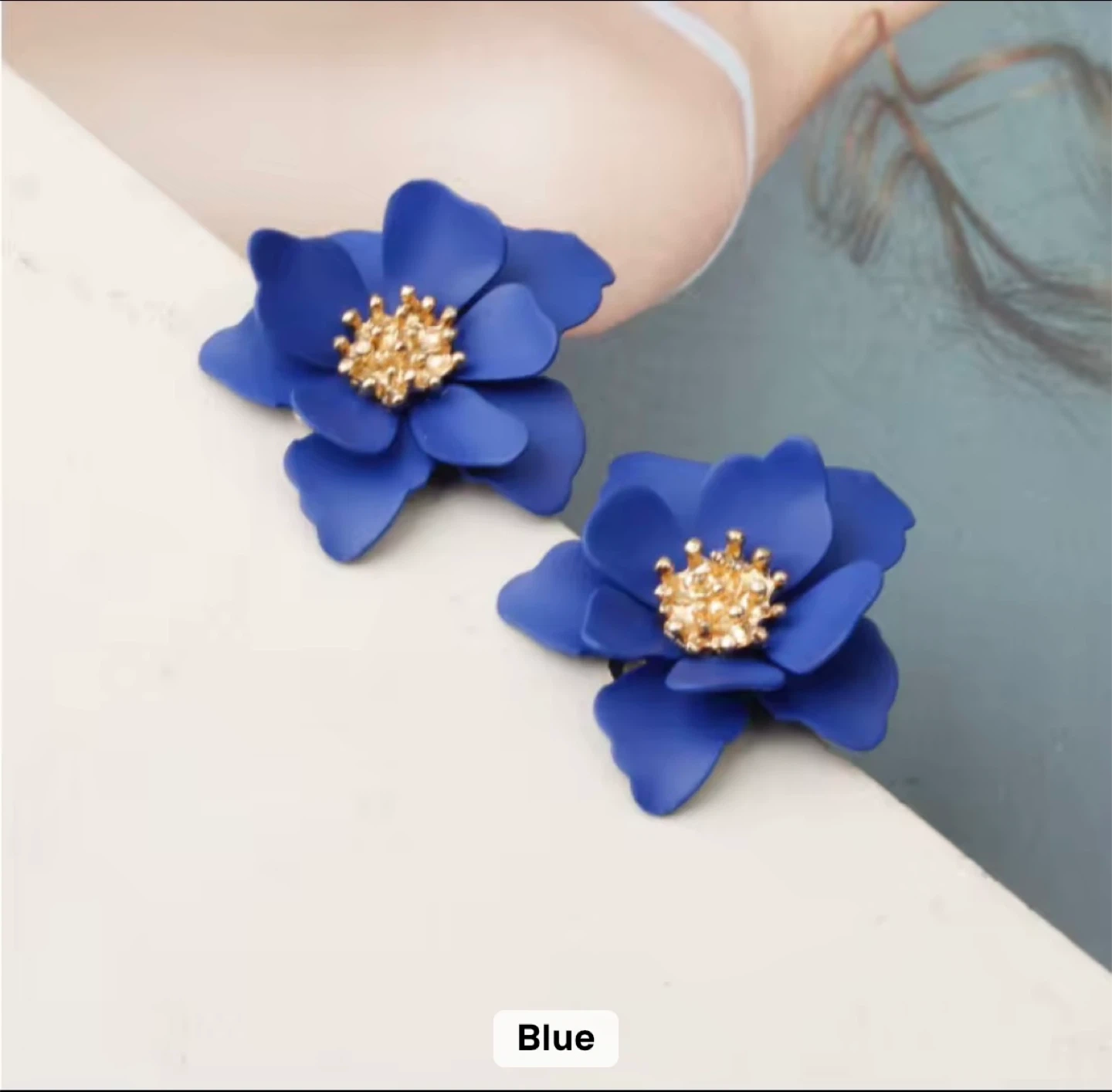 These blue floral stud earrings feature a gold-tone centre. They're crafted from a matte material and come on a backing card. Adds a pop of colour to any outfit!