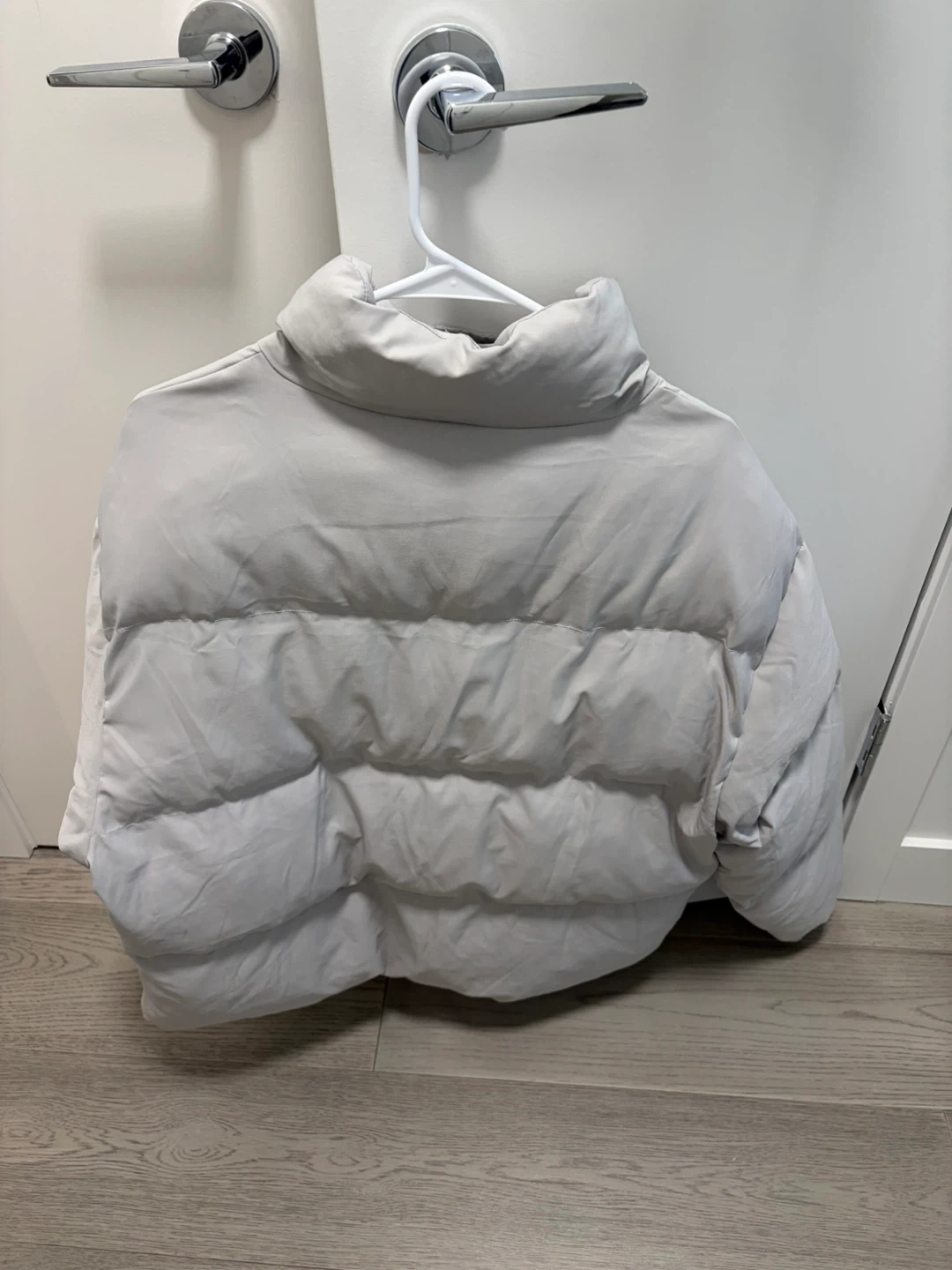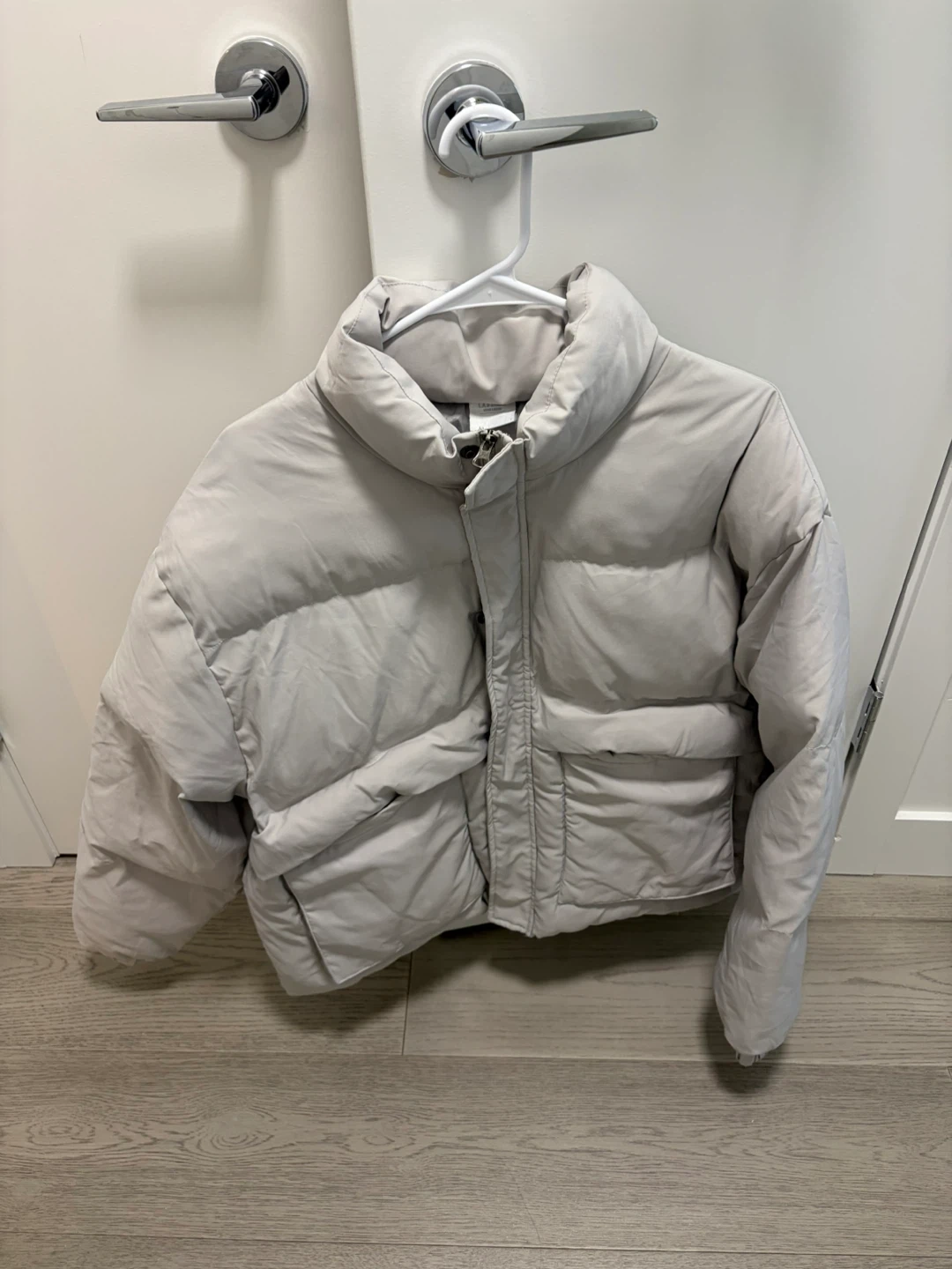 Selling a gently used puffer jacket in a light grey colour.