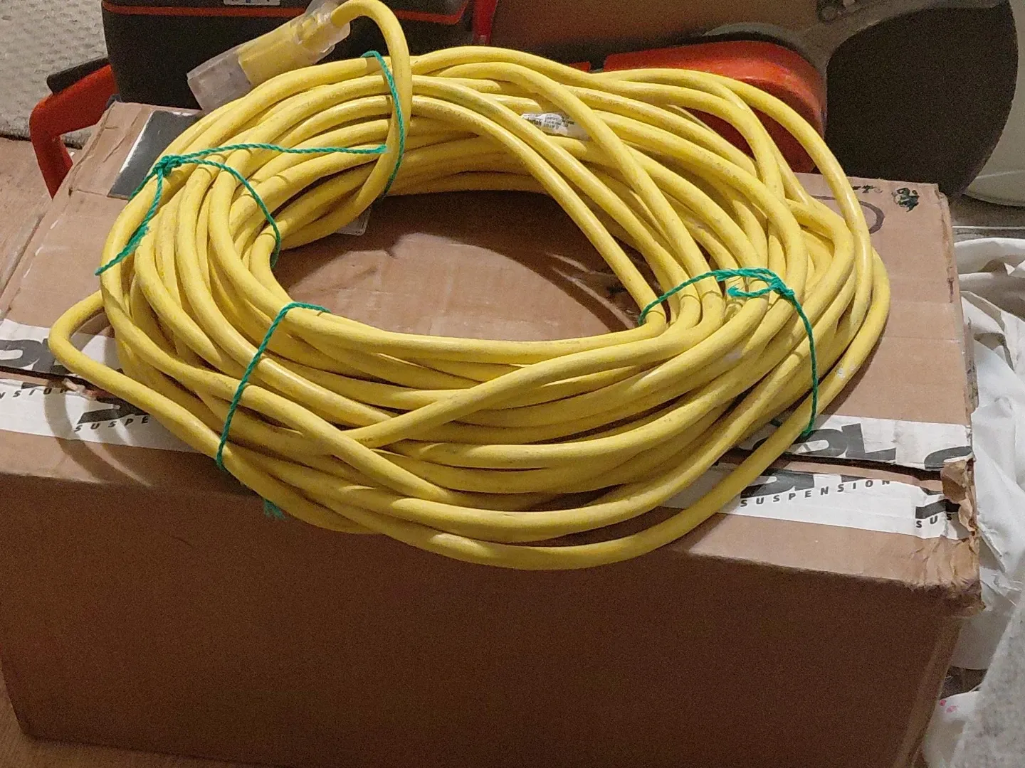This is a bright yellow outdoor extension cord. It's designed for durability in various weather conditions. This cord is perfect for powering tools or lighting at a worksite or backyard gathering. Get reliable power delivery for all your outdoor needs!