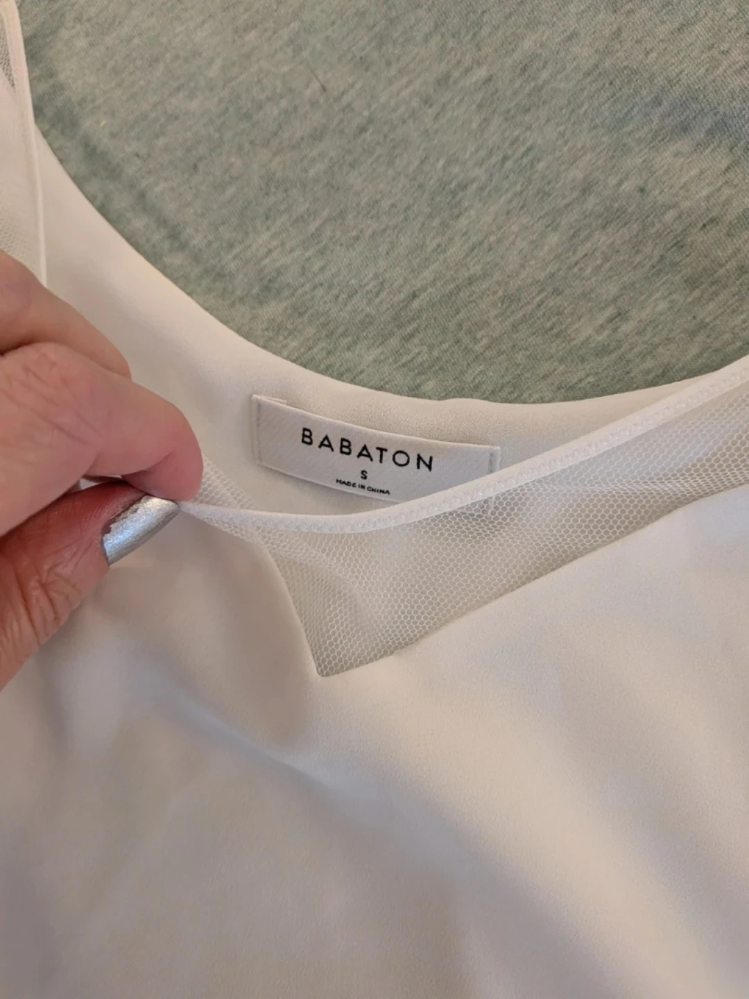 White sheer tank top by Babaton. Made with 100% polyester for the body and exclusive of ornamentation. It has delicate adjustable straps and a mesh accent at the neckline. A nice layering piece!