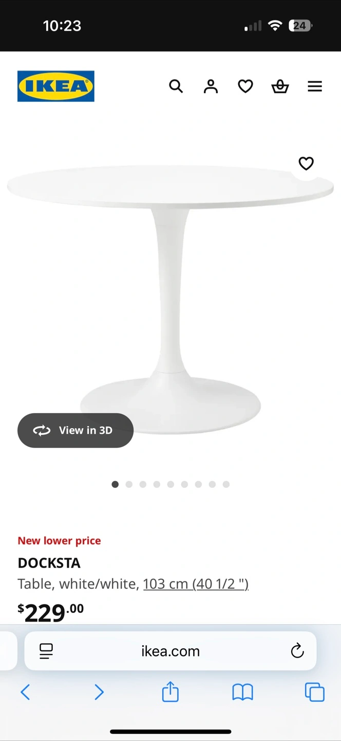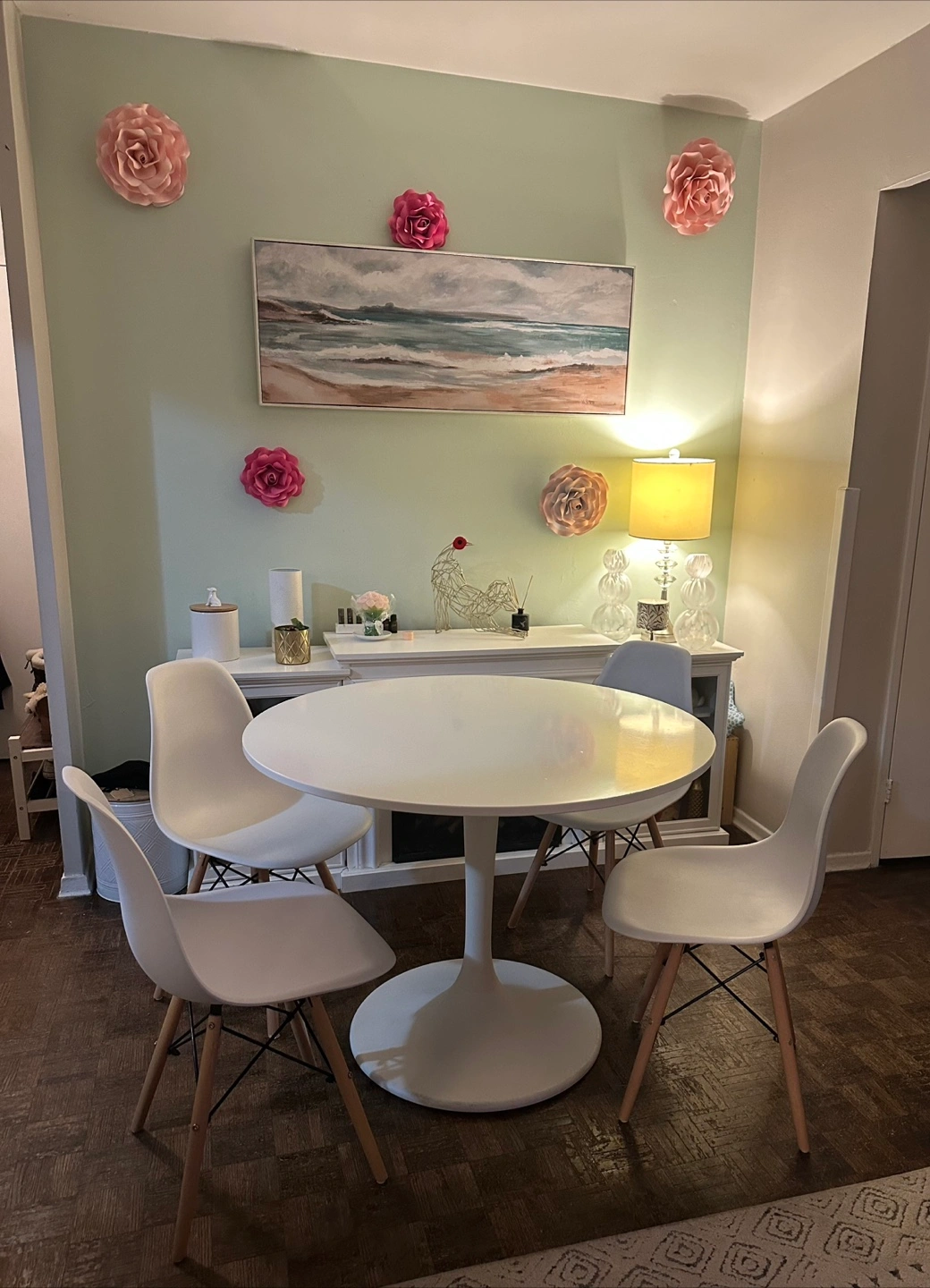 White round dining table. 103 cm diameter. Minimalist design. Good condition, some imperfections, see pictures. Four chairs included.