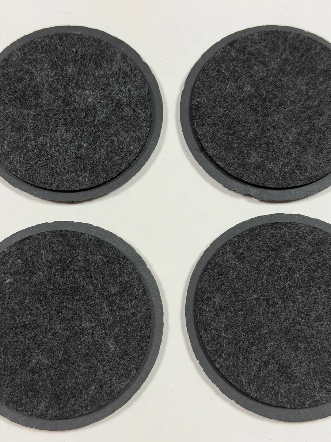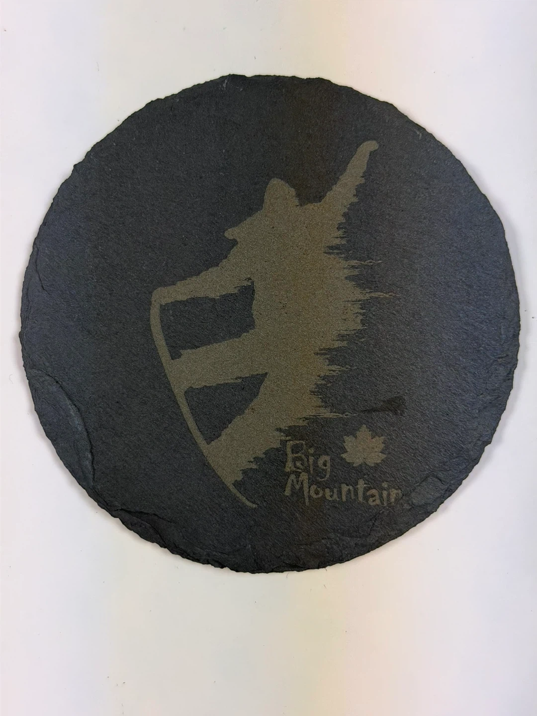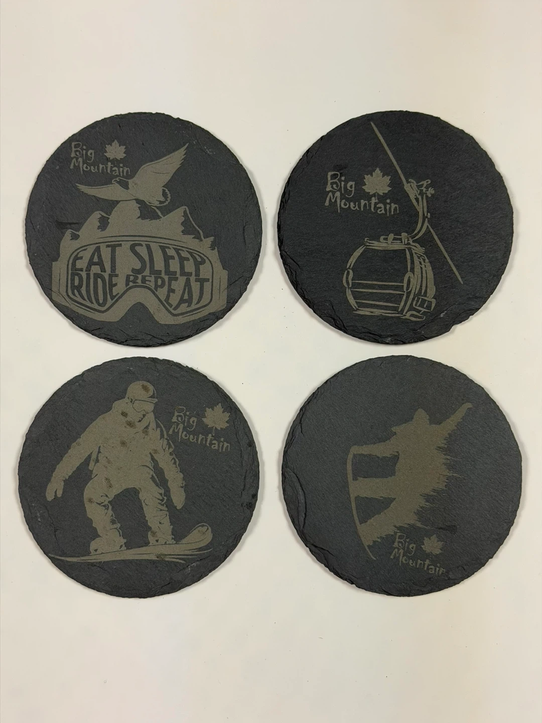 This set includes four slate coasters featuring Canadian mountain themes. Designs include a gondola, an eagle with goggles, and snowboarders. They're made of durable slate. with anti slip backing support and also to avoid table surfaces scratches. made in canada