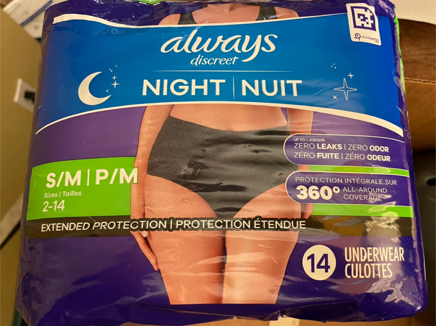 Always Discreet Night underwear for extended protection. It offers zero leaks and zero odour with 360° all-around coverage. This package contains no 13 underwear culottes. They are scented.
