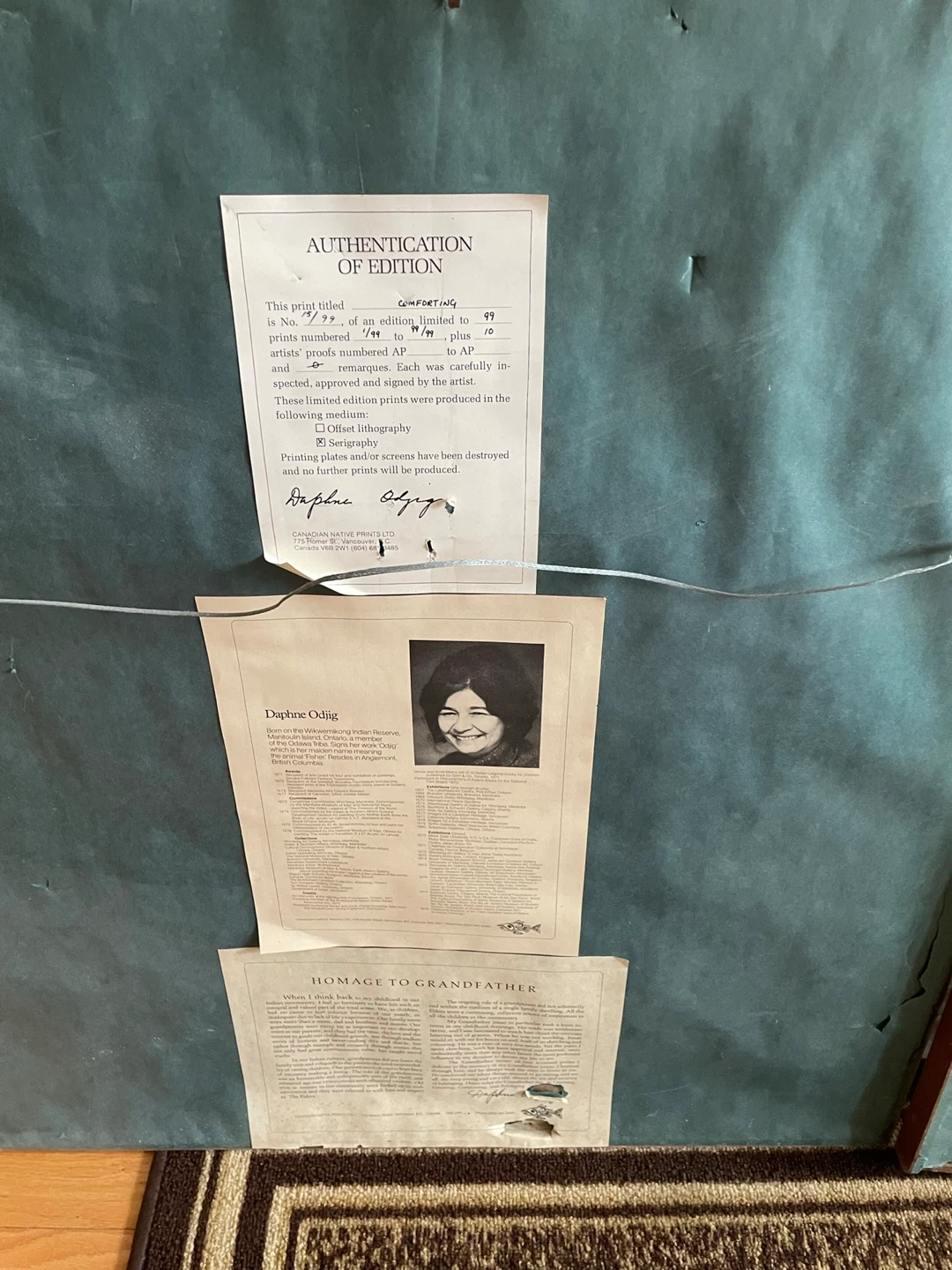 Framed limited edition lithograph by Daphne Odjig, titled "Homage to Grandfather." This print is number 78 of an edition of 99, with 10 artist's proofs. It's a beautiful piece of Indigenous art.