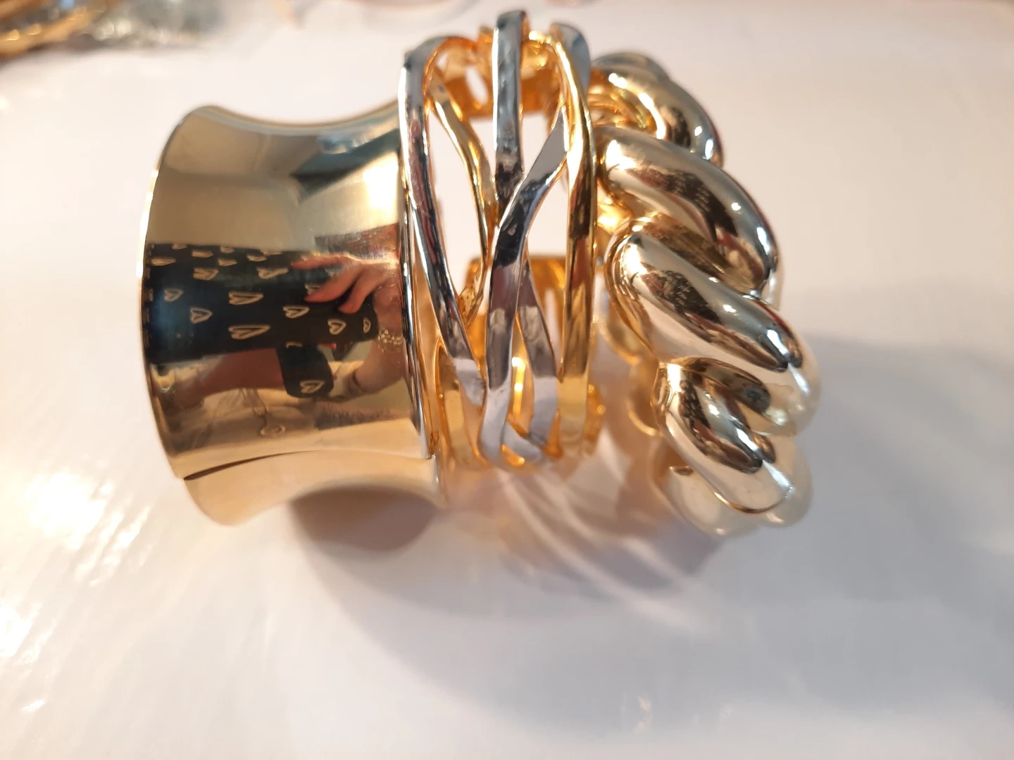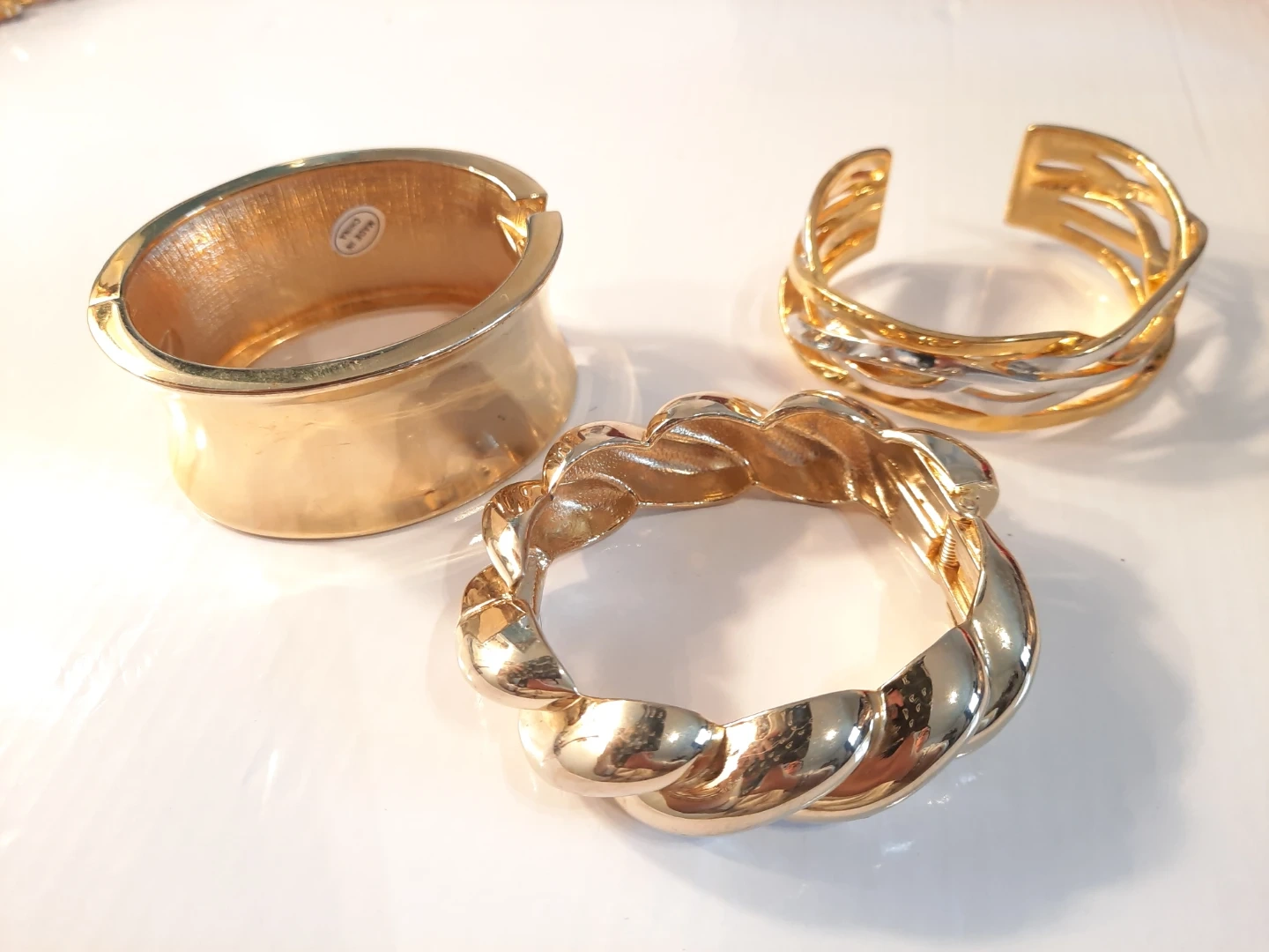 Three stylish gold-tone bracelets. Includes a wide cuff, a twisted rope design, and a wavy layered cuff. These pieces add a bold statement to any outfit!2 of them open to put it trough.