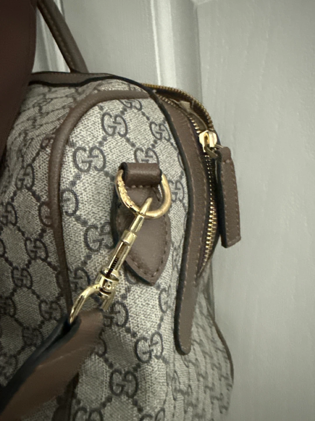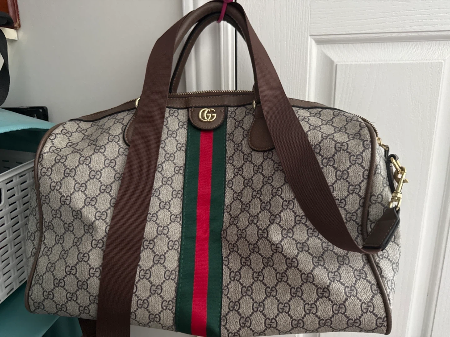 This Gucci duffel bag is made from the brand's signature monogram canvas with brown leather trim. It features the iconic green and red stripe detail. It's a stylish option for weekend trips or as a carry-on.