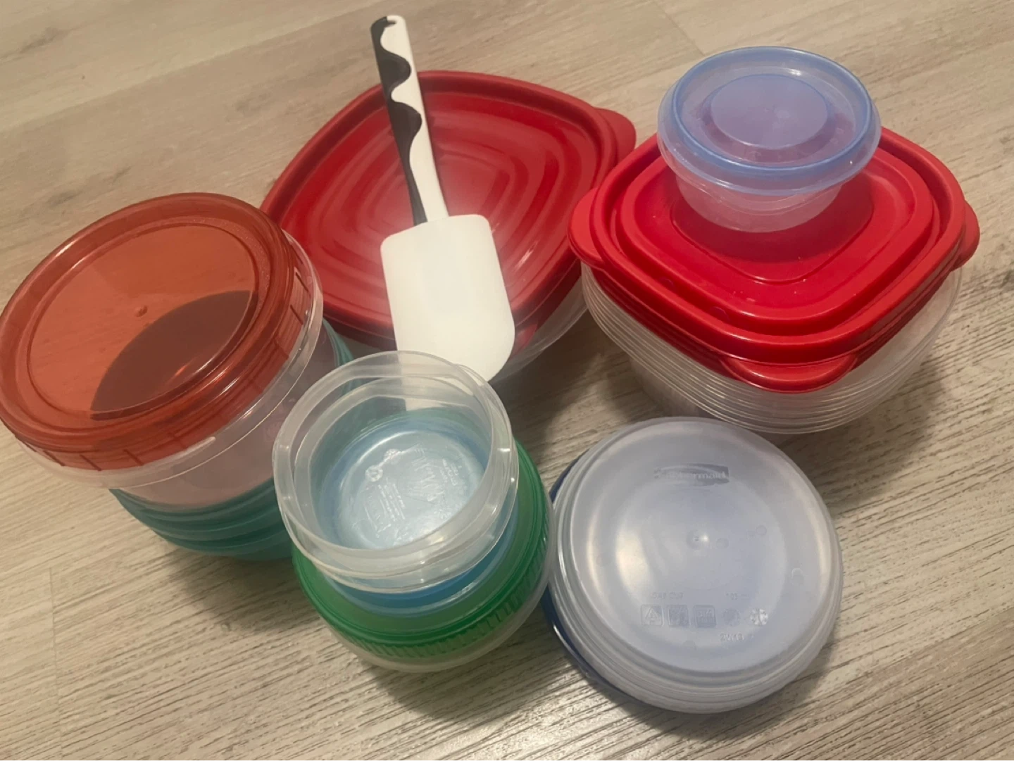 Assorted Rubbermaid food storage containers in various sizes. Includes a white spatula with black polka dots. These are great for leftovers or meal prepping.