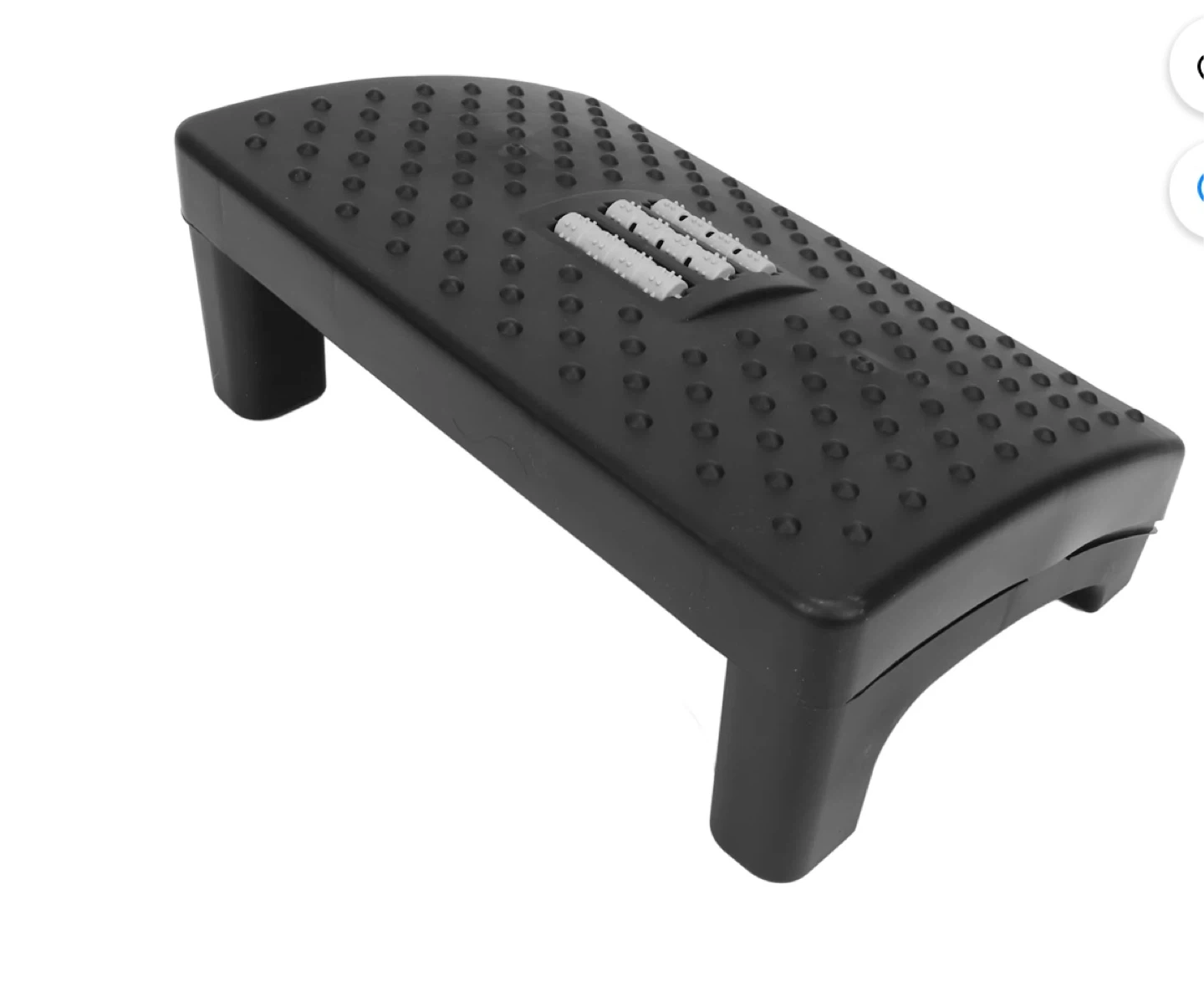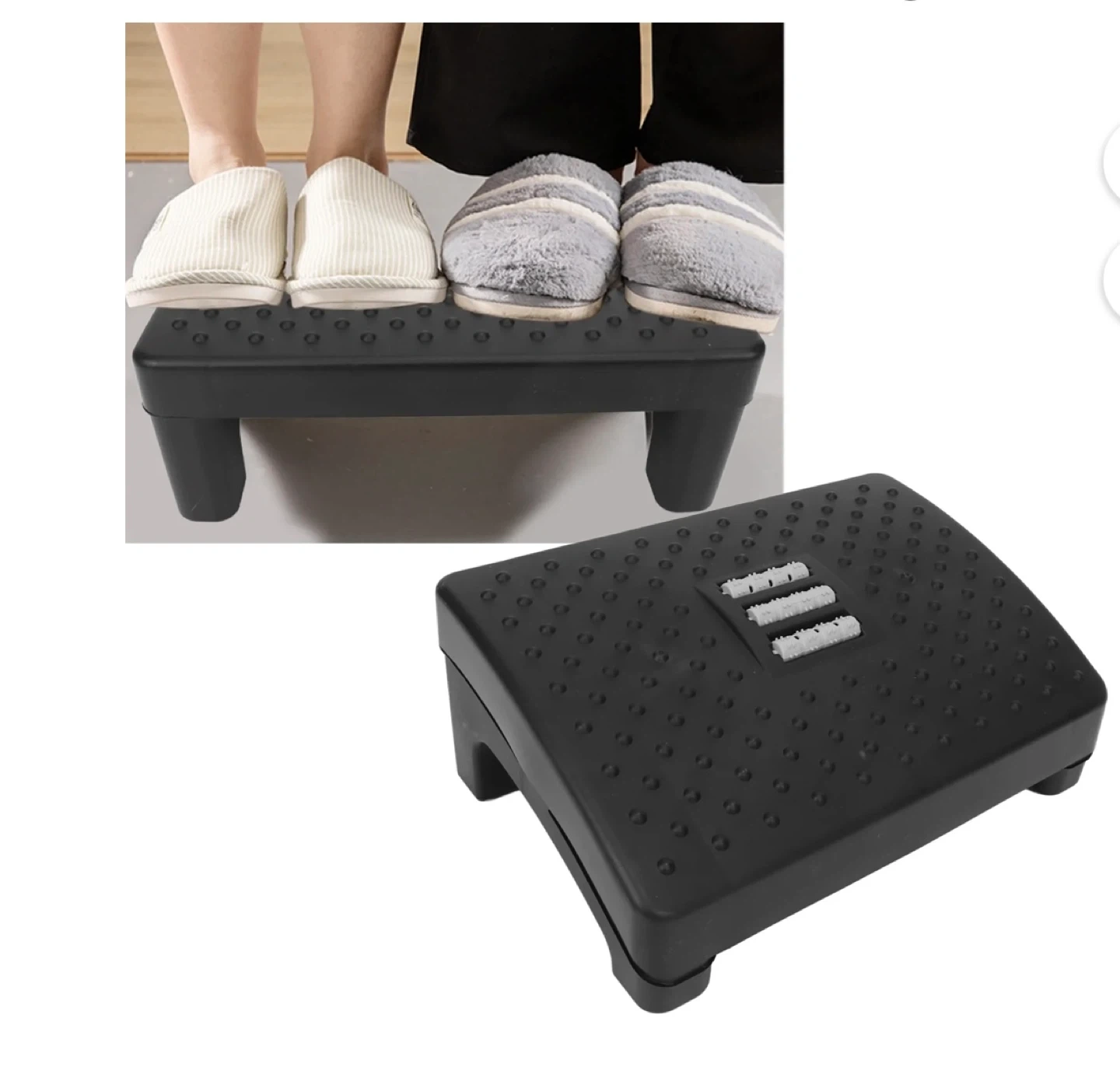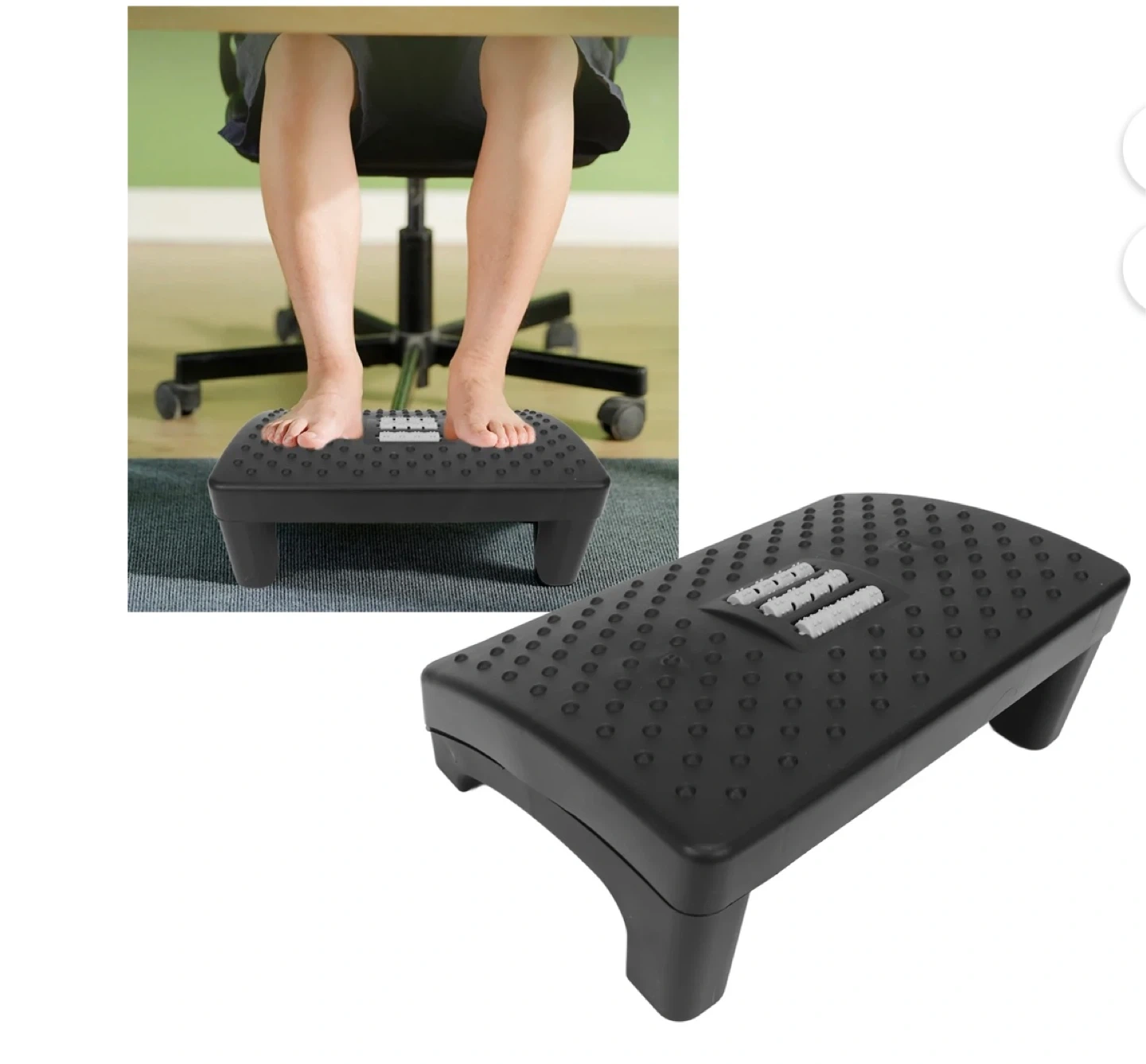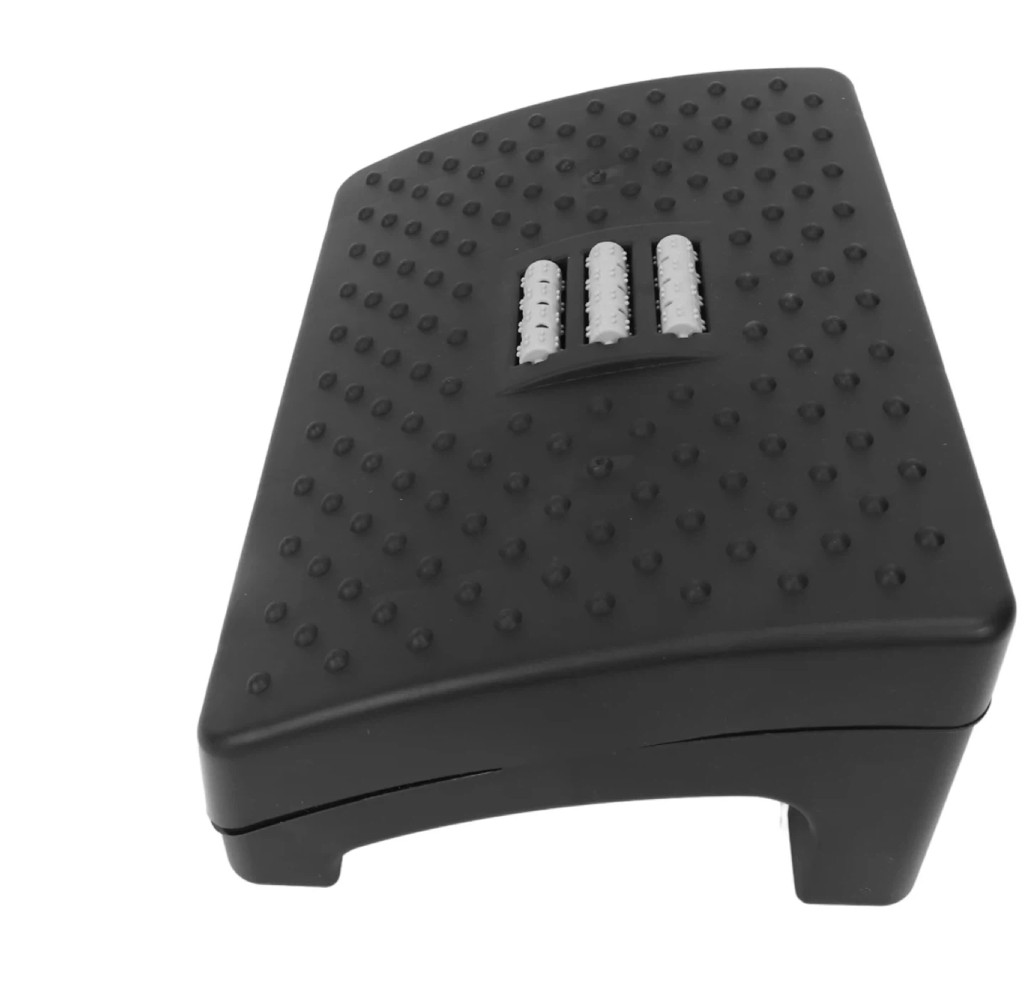 This is a black footrest designed for comfort. It has a textured surface with three rollers for foot massage. Its sturdy design supports your feet while sitting at a desk.