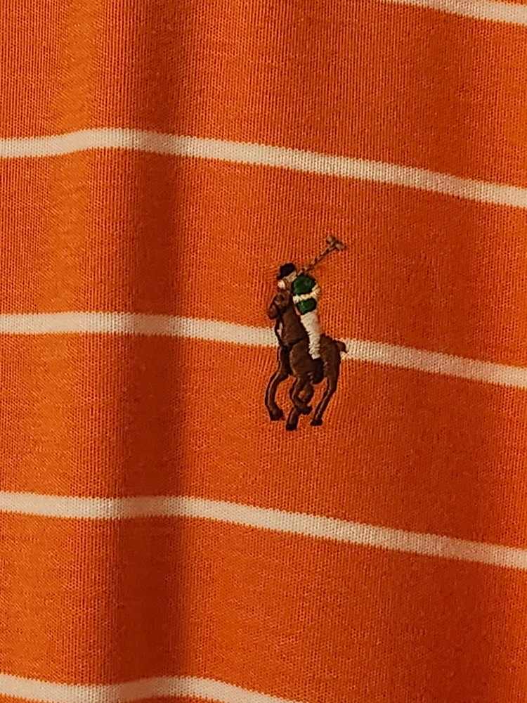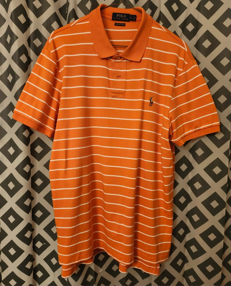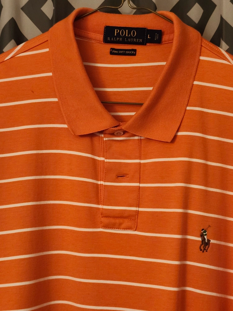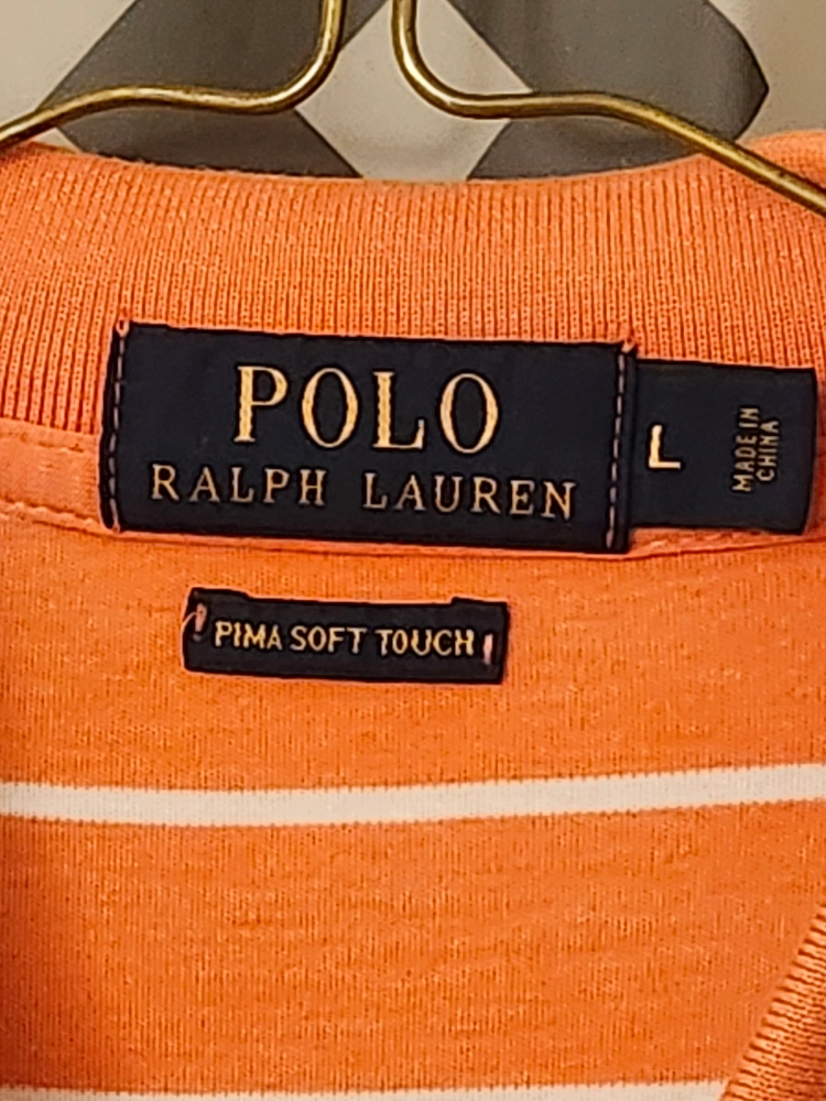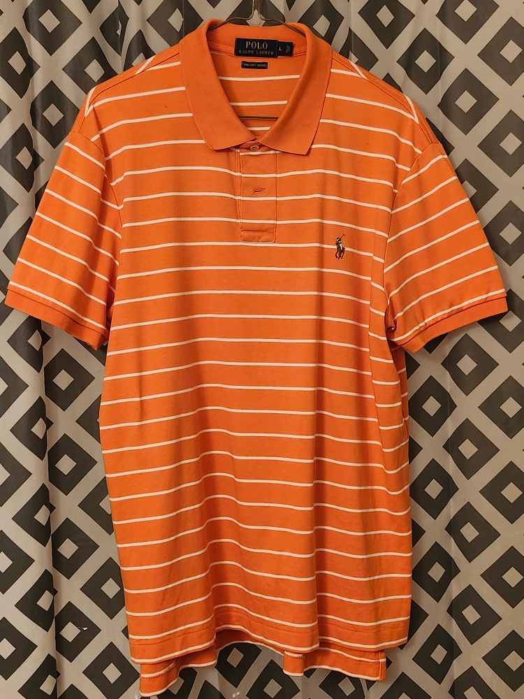 Men's size large Polo Ralph Lauren polo shirt. Orange and white horizontal stripes. Pima soft touch fabric. Classic fit.